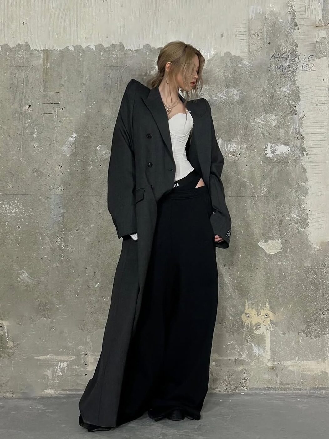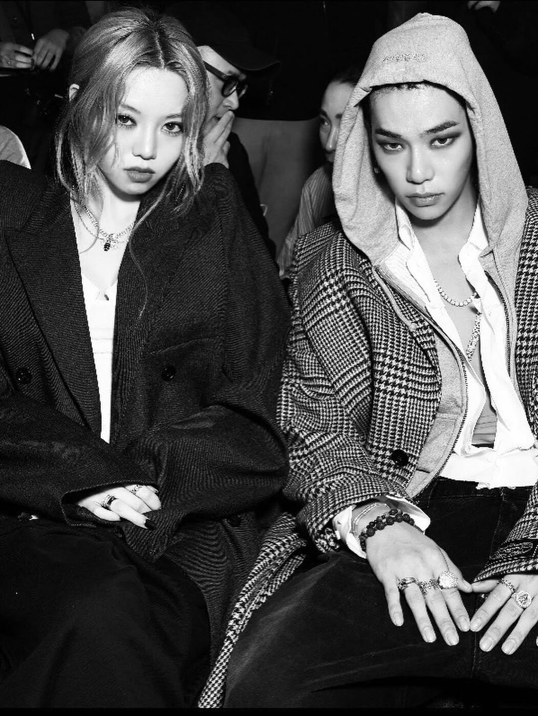 다음은 베트멍 쇼에 등장한 베일리와 타잔입니다. 세련된 하운드투스 코트에 크롭 후디와 새깅한 팬츠로 스트릿한 감성을 더해준 타잔과 코르셋 톱에 한껏 어깨가 치솟은 맥시 코트를 걸쳐 드라마틱한 룩을 선보인 베일리는 과감하고 힙한 베트멍과 잘 어울렸죠. 이날 룩의 무드에 맞춰 도발적인 스모키 메이크업을 한 채 쇼를 지켜보는 베일리와 타잔의 모습은 강렬한 인상을 남기기에 충분했습니다.