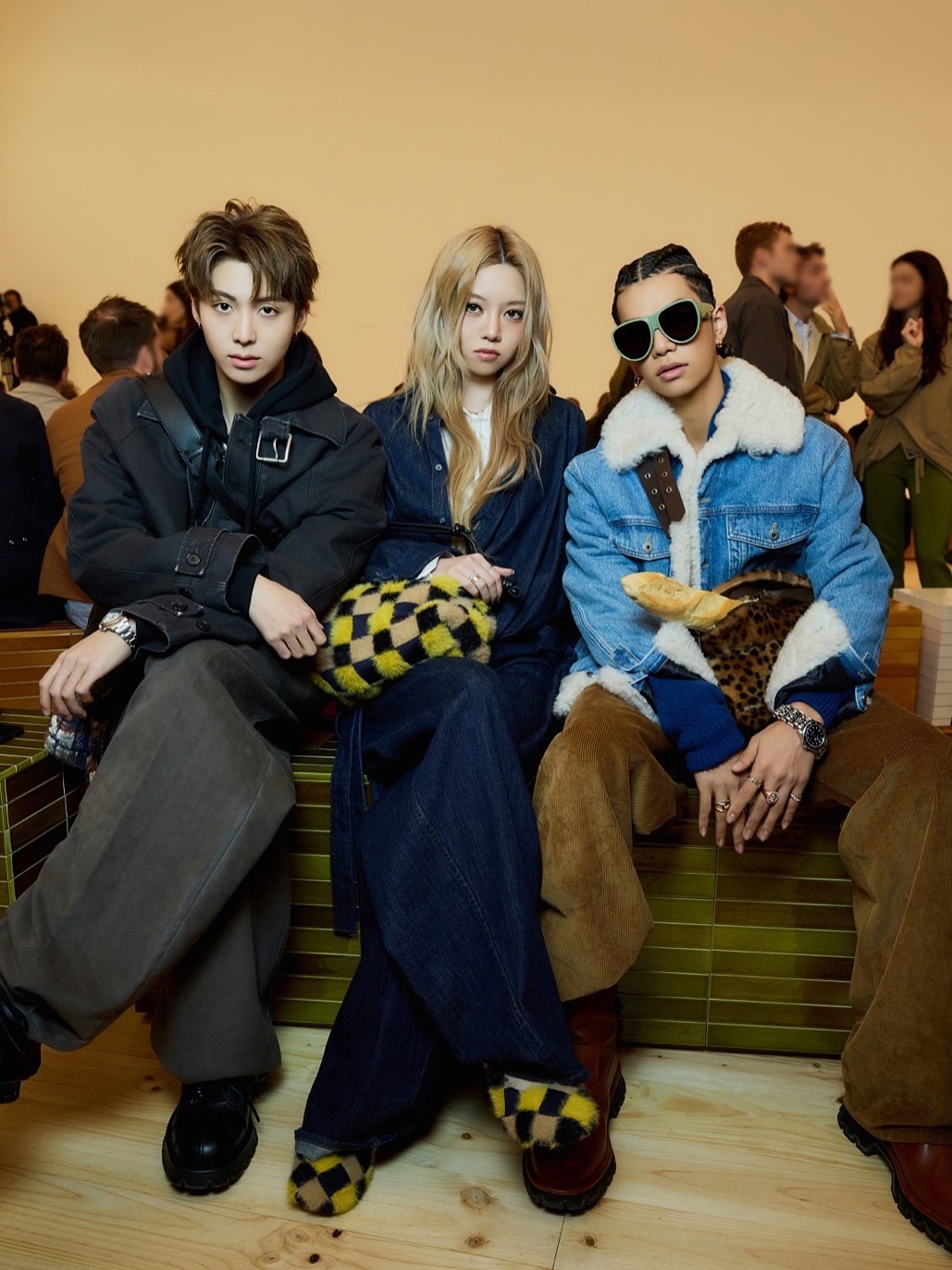 로에베를 찾은 베일리, 타잔, 우찬은 그동안 패션 위크에서 보여준 컨셉츄얼하고 센 모습과는 달리 보다 편하고 캐주얼한 차림이었습니다. 먼저 베일리는 짙은 네이비 컬러의 데님 온 데님 룩에 원색적인 색을 사용한 이번 로에베 쇼에 맞춰 노란 체커보드 패턴의 퍼 슈즈와 백으로 포인트를 줬죠. 시어링 디테일의 데님 트러커 재킷에 브라운 코듀로이 팬츠를 매치한 타잔은 가방엔 바게트를 꽂아 위트 있는 평소 성격을 그대로 보여줬습니다. 차분한 그레이시 톤으로 맞춰 깔끔한 워크 웨어 스타일을 보여준 우찬은 이들 사이에서 확실한 중심을 잡아주기도 했죠.
