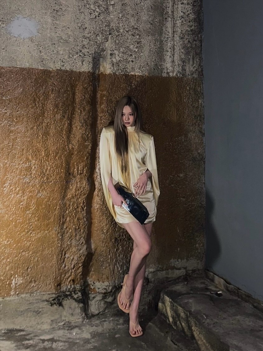 뮈글러 쇼에 참석한 베일리는 그동안 보여줬던 힙한 스타일과는 정반대의 룩을 입고 나타났습니다. 케이프 모티프의 레몬빛 새틴 드레스를 입은 성숙한 모습이었죠. 여기에 길쭉한 미러 클러치와 플립플롭 힐로 마무리해 도회적인 분위기를 더했습니다.