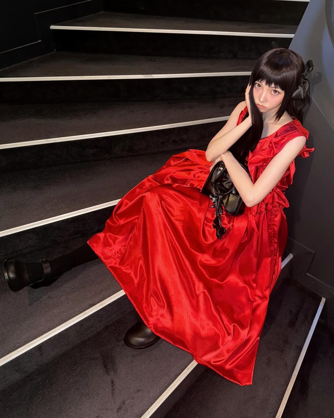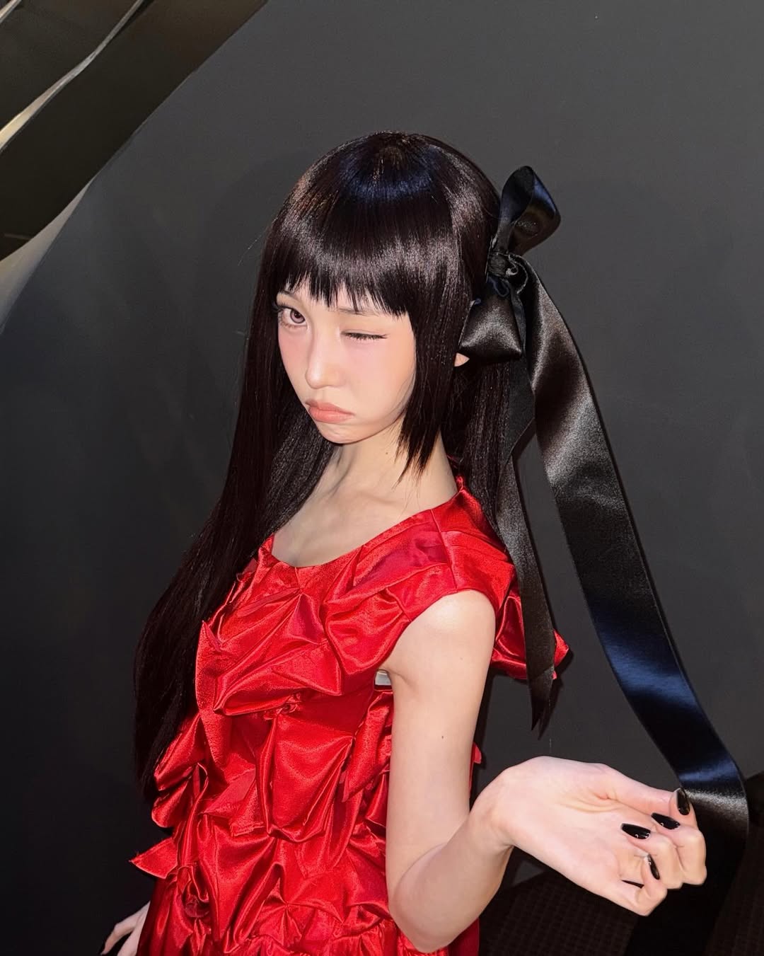 홀로 꼼데가르송 쇼에 등장한 막내 영서는 마치 한 편의 동화 속 주인공을 연상케 했는데요. 조형적인 드레이프가 특징인 레드 드레스에 길게 내려뜨린 블랙 리본 핀으로 러블리한 무드를 더한 그녀는 아방가르드한 꼼데가르송 걸 그 자체였죠.