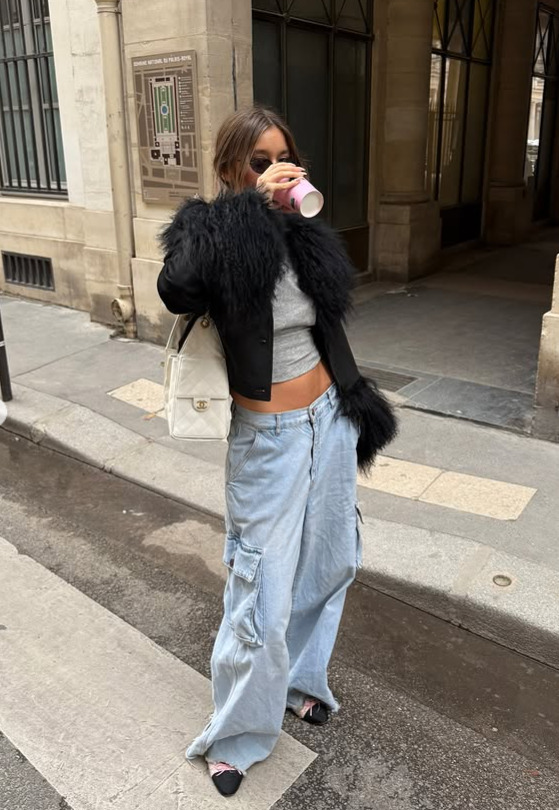 이번 시즌 와이드 핏의 데님 팬츠를 세련되게 입기 위해선, 캐미솔 혹은 탱크 톱 등의 이너웨어의 매칭도 중요해요. 그래야 특유의 패셔너블한 껄렁함이 완성되죠. 그레이 탱크 톱에 이번엔 주머니가 달린 카고 스타일의 와이드 팬츠를 입어주었네요. 퍼 트리밍의 빈티지한 블랙 재킷으로 가을 보헤미안 무드를 한껏 끌어올렸습니다.