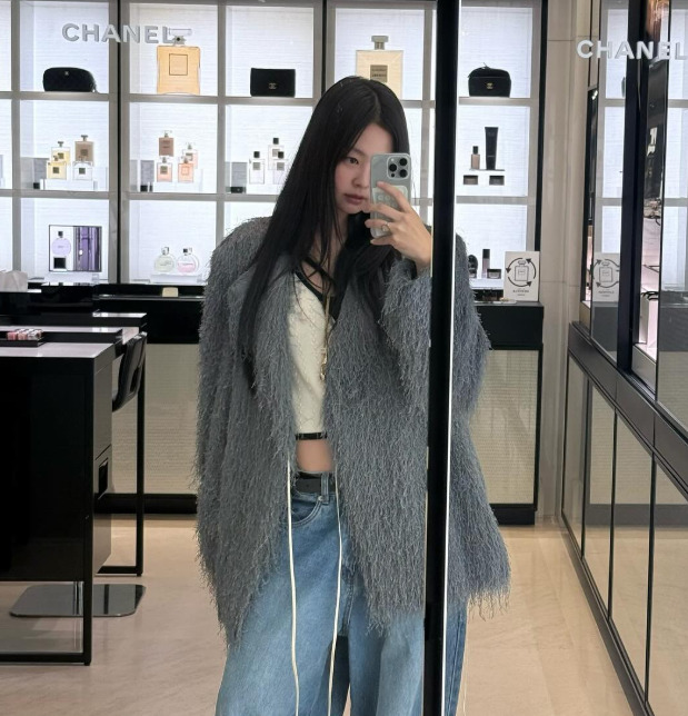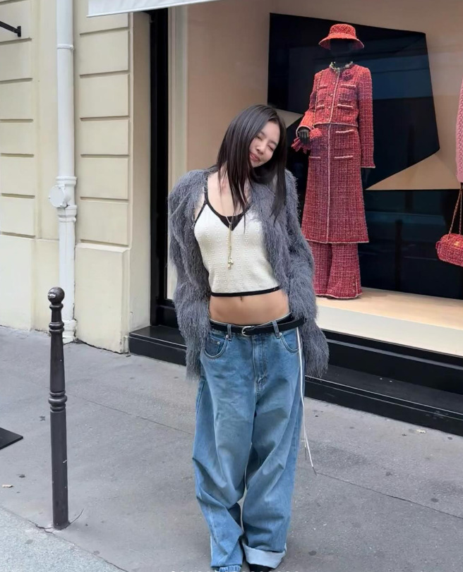 얼마전 파리를 방문했던 제니의 오프 듀티 룩에서도 이 와이드 데님 팬츠는 시선을 사로잡습니다. 특히 가성비 아이템으로 입소문을 탄, 그 청바지 또한 치골이 보일 정도로 한껏 내려 입은 디테일이 눈에 띄었어요. 역시나 가벼운 캐미솔 형태의 톱을 입고선 블랙 벨트를 착용한 통 넓은 청바지. 제니는 가벼운 느낌의 퍼 재킷을 걸쳐 보호 시크로 소화했어요.