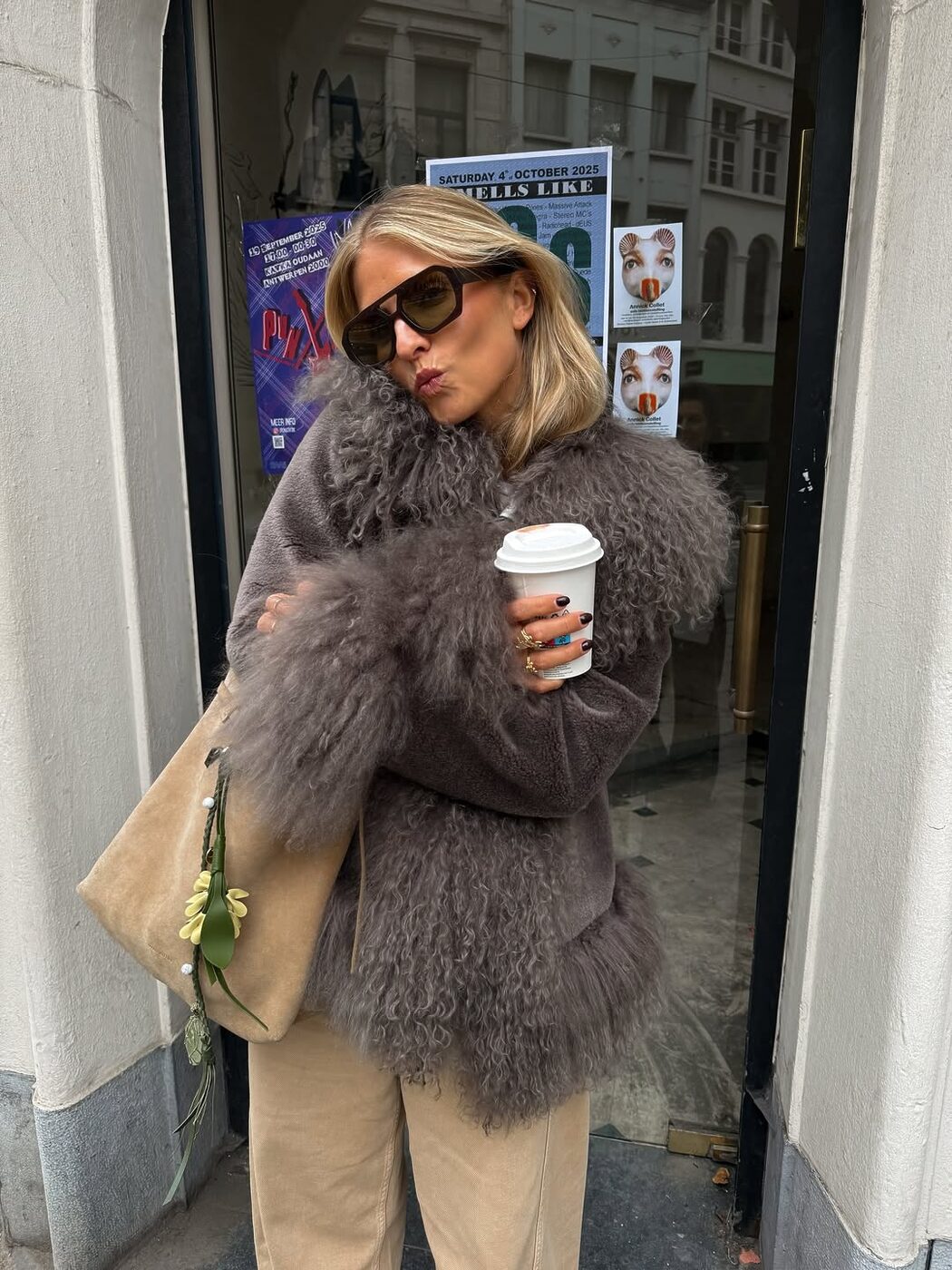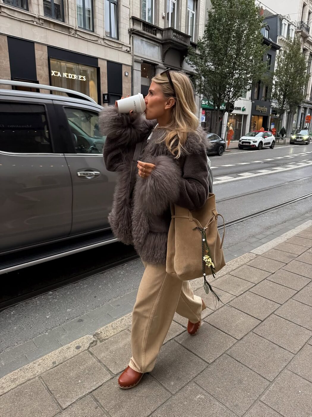 퍼 트리밍 재킷을 입는 재미 중 하나는 빈티지한 매력을 살리는 것입니다. 인플루언서 까밀 쉐리에는 플라워 자수가 더해진 빈티지한 코트에 레오파드 부츠를 매치했네요. 섹스 앤 더 시티의 캐리가 생각나는 옷차림입니다.