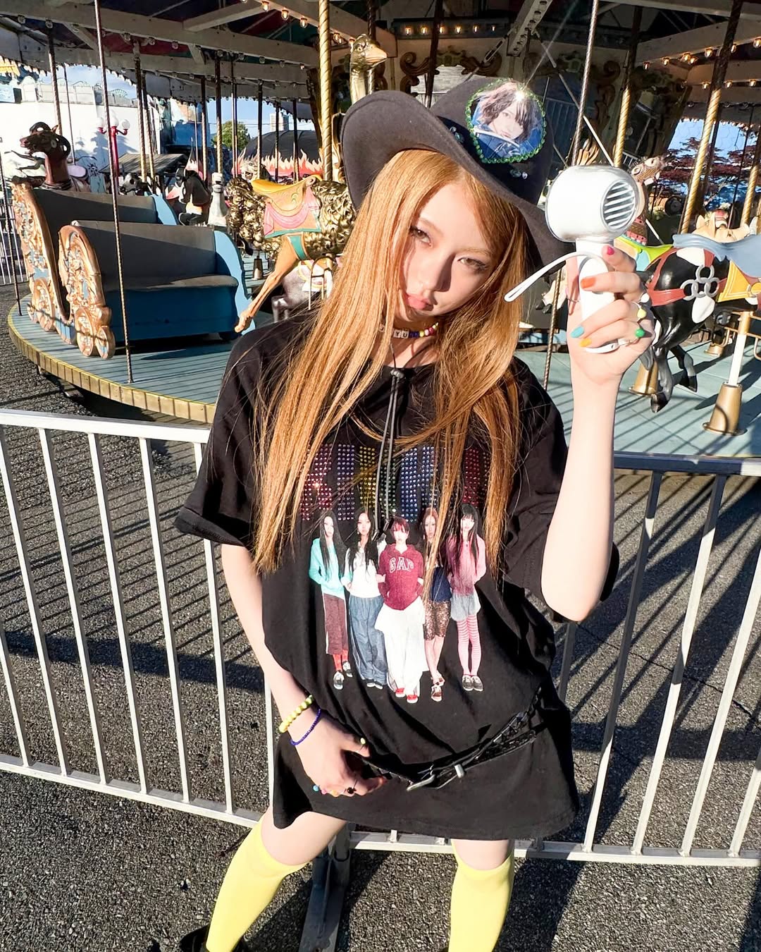 스타킹을 활용하면 과감한 컬러에도 손쉽게 도전할 수 있습니다. 노출 면적이 작기 때문에 눈에 확 들어오는 색상도 부담 없이 즐길 수 있죠. 얼굴이 큼직하게 프린팅된 키키 멤버들의 블랙 티셔츠 룩이 더 쿨 해 보이는 이유도 여기에 있어요. 자유분방한 라임, 핫핑크 컬러의 스타킹을 매치해 키치한 무드를 한껏 끌어올렸죠. 전체적인 조화보다는 일부러 충돌하는 네온 컬러를 선택해 룩에 위트를 더했습니다.