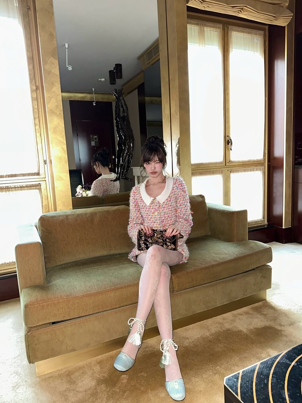 이번 파리 패션 위크에서 나란히 발렌티노 걸로 변신한 아이브 레이와 리즈. 두 사람 모두 스타킹을 활용해 공주님 같은 고풍스러운 룩을 완성했습니다. 레이는 차이나 칼라에 리본이 달린 블랙 미니 드레스에 화려한 꽃무늬가 그려진 블랙 스타킹을 매치해 고딕 분위기의 룩을 연출했고, 리즈는 알록달록한 트위드 재킷에 은은한 광택의 화이트 플라워 스타킹을 더해 한층 러블리한 무드를 완성했죠.
