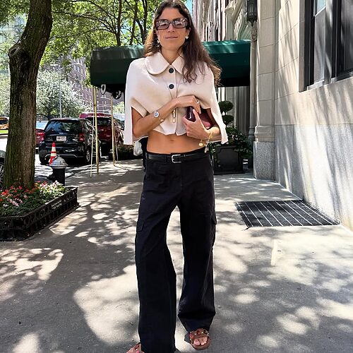 매니시한 쇼츠에 길이가 긴 케이프를 매치한다면 좀 더 특별한 환절기 룩이 완성됩니다. 본격적으로 가을 외투를 걸치기엔 덥지만 이 계절의 정취를 즐기고 싶은 이들에게 제격이죠. 우아하게 자연스러운 드레이핑을 선사할 롱, 케이프 톱에는 클러치 백과 플랫 슈즈로 럭셔리한 스타일링을 연출했습니다