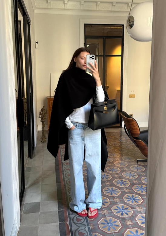 케이프라 하면 왠지 모르게 거추장스럽고 부담스러운 스타일이 떠오른다면, 이제 그 편견을 버리세요. 머플러와 그 경계가 애매해진 휠씬 더 웨어러블한 형식의 케이프가 이번 가을 옷장을 우아하게 만들어 줄 예정입니다. 케이프를 가장 세련되게 입는 법은 바로 꾸미지 않은 듯한, 평범한 청바지에 흰 맨투맨 톱 위에 툭 걸쳤을 때예요. 백은 클래식하게, 발끝은 레드 플립플롭으로 에지를 더했습니다.