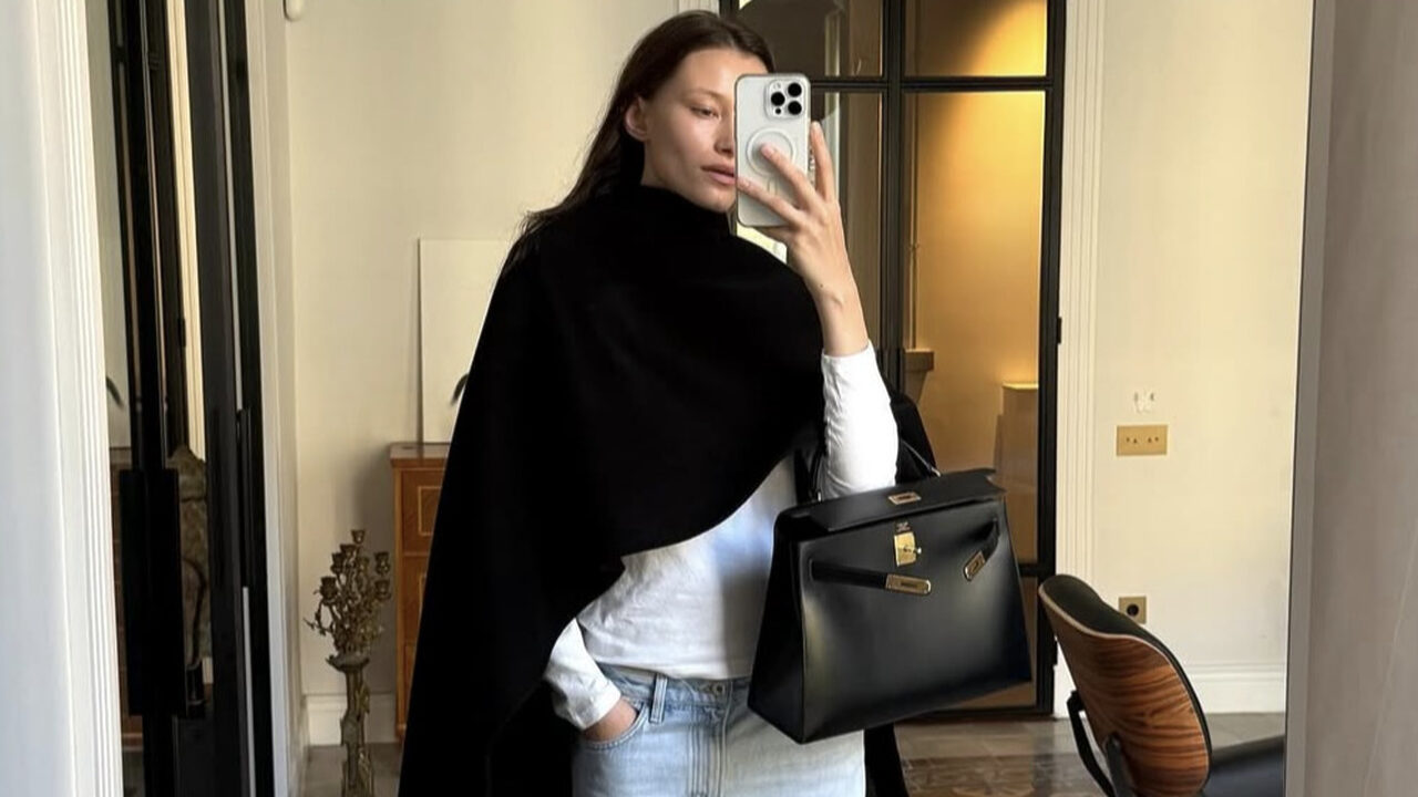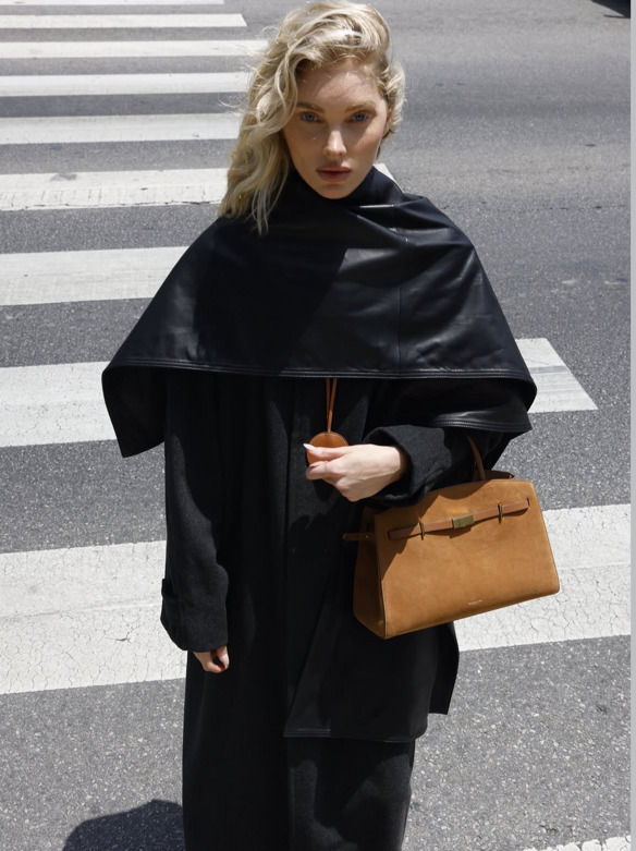 날씨가 좀 더 쌀쌀해 진다면 아우터 위에 케이프를 둘러 주세요. 보온효과는 물론, 옷차림에 품격을 더하기까지 합니다. 블랙 코트 위에 레더 소재의 블랙 케이프를 둘러 은은하게 시선을 사로잡는 에지 넘치는 룩을 선보였습니다. 케이프 룩엔? 클래식한 토트 백이 찰떡궁합이죠.