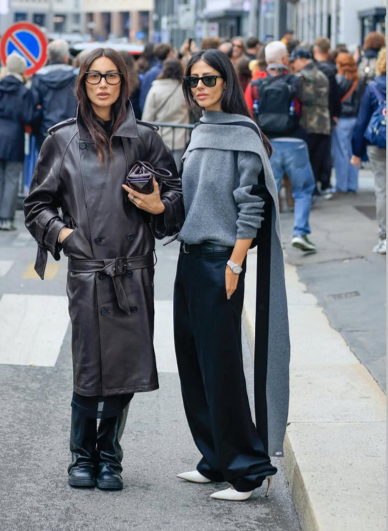 케이프 또한 셋업 패션이 유행이라는 것, 톱 혹은 아우터와 같은 소재와 컬러를 사용해 한층 더 셋업이 된 룩을 선보이기도 합니다. 모던하고 시크한 그레이 톱과 블랙 팬츠 룩에는 같은 그레이 톤의 롱 머플러를 케이프처럼 둘러 드라마틱하고 엘레강스한 스타일링을 완성했어요.