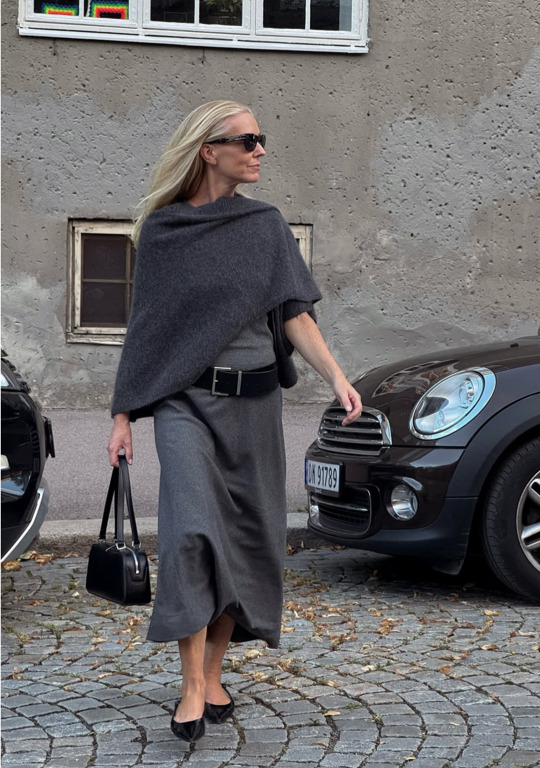 기품이 넘치되 과장되지 않을 것, 케이프 스타일링에 가장 중요한 조건입니다. 그레이 컬러의 미디 드레스에 빅 버클 벨트와 미니멀한 토트 백과 발레 슈즈로 시크한 모노 룩을 완성했다면, 그 위에 한 톤 다운된 다크 그레이의 케이프를 휙, 둘러주었습니다.