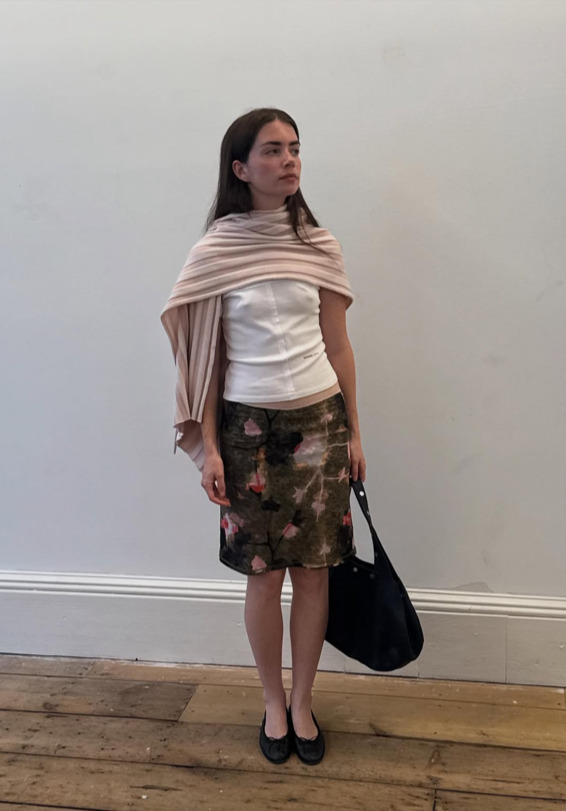 폭이 넓은 머플러를 케이프로 활용하는 것도 방법이죠. 브라운 컬러의 미디 스커트에 심플한 톱을 매치한 룩에는 연한 핑크 색의 니트 머플러를 둘러 케이프 효과를 주었습니다.