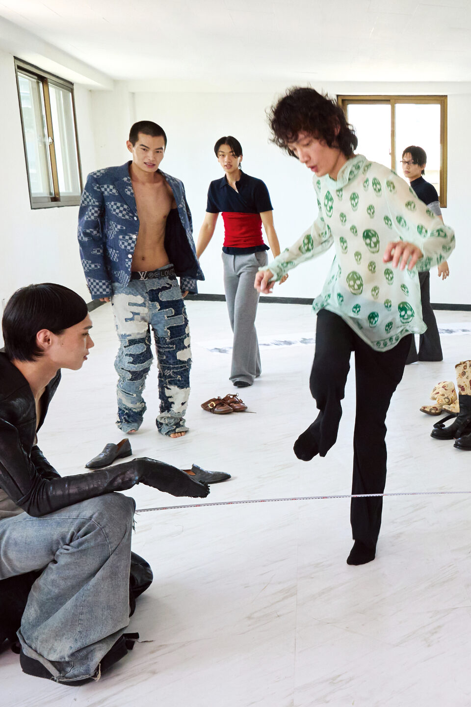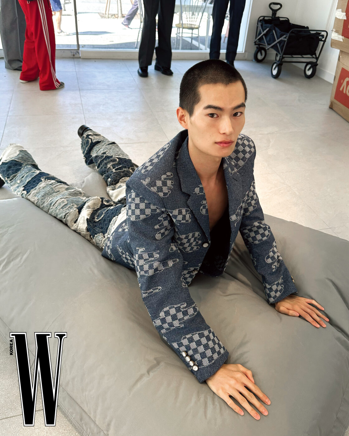 카무플라주 패턴의 데님 재킷과 패치워크 데님 팬츠, 슈즈는 Louis Vuitton 제품.