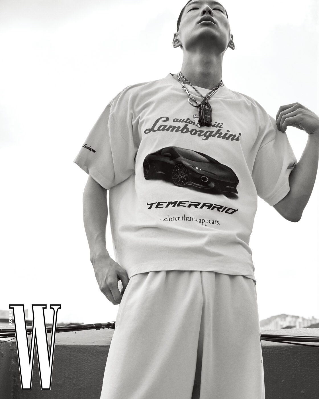 람보르기니 프린트 티셔츠, 스웨트 팬츠, 네크리스는 Balenciaga 제품.