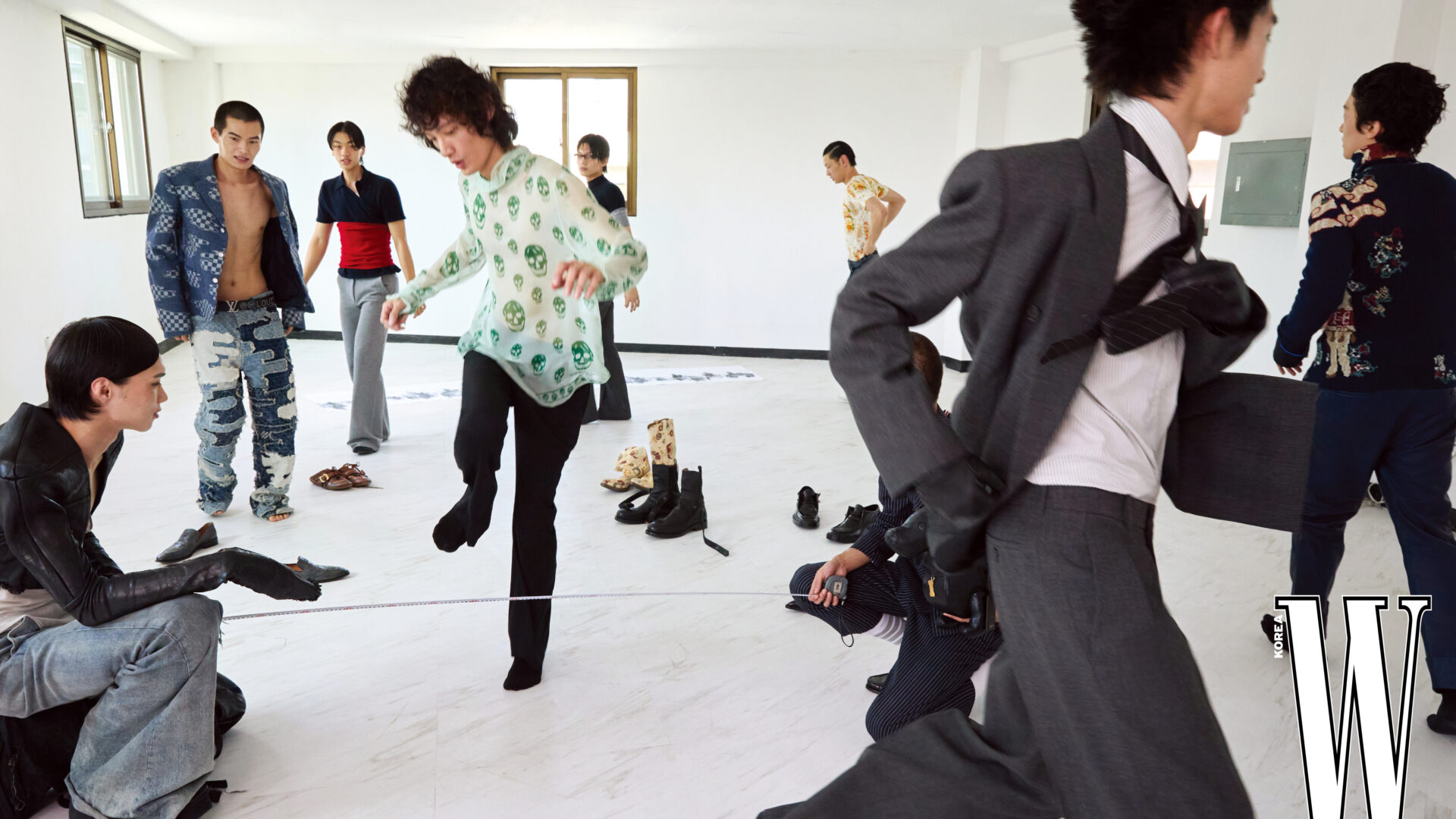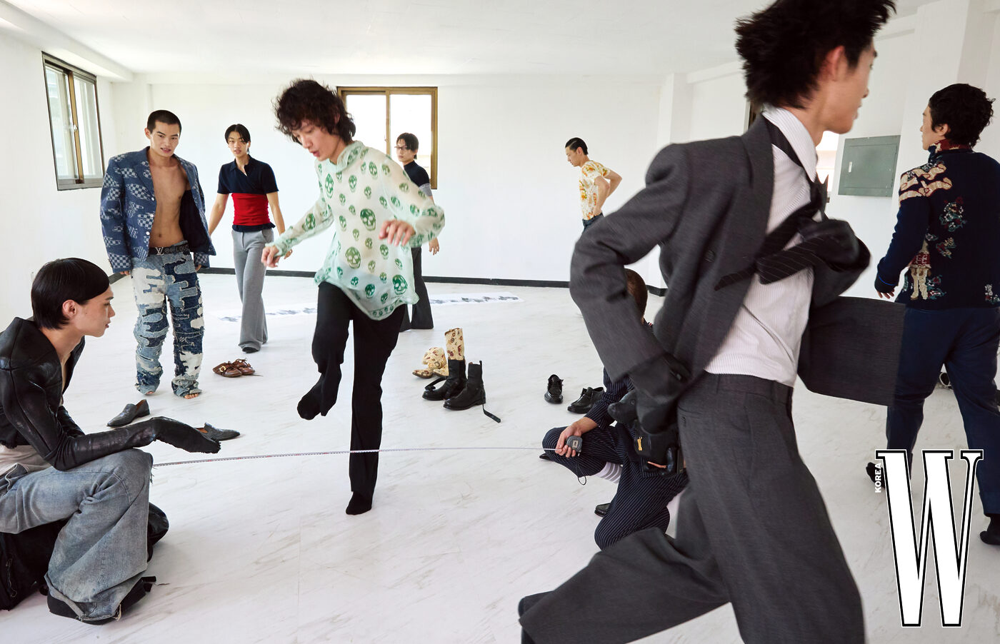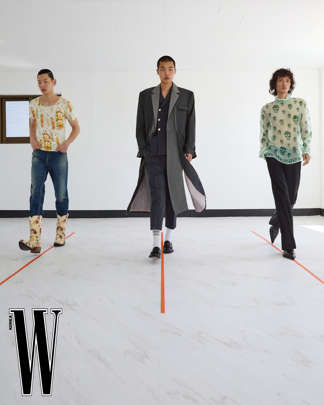 왼쪽부터 | 꽃무늬 티셔츠와 데님 팬츠, 꽃무늬 웨스턴 부츠는 Prada, 그레이 코트와 안에 입은 핀스트라이프 슈트와 팬츠, 양말, 슈즈는 Thom Browne, 해골 프린트 블라우스와 검정 팬츠, 슈즈는 캡션 Mcqueen 제품.