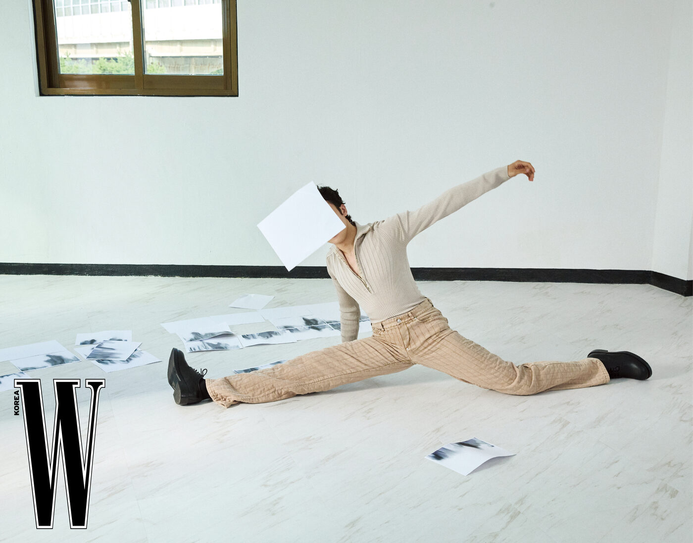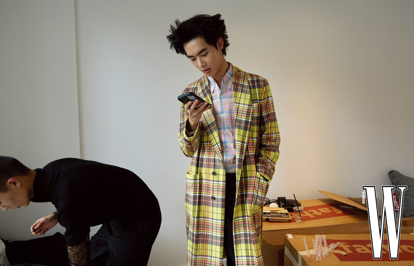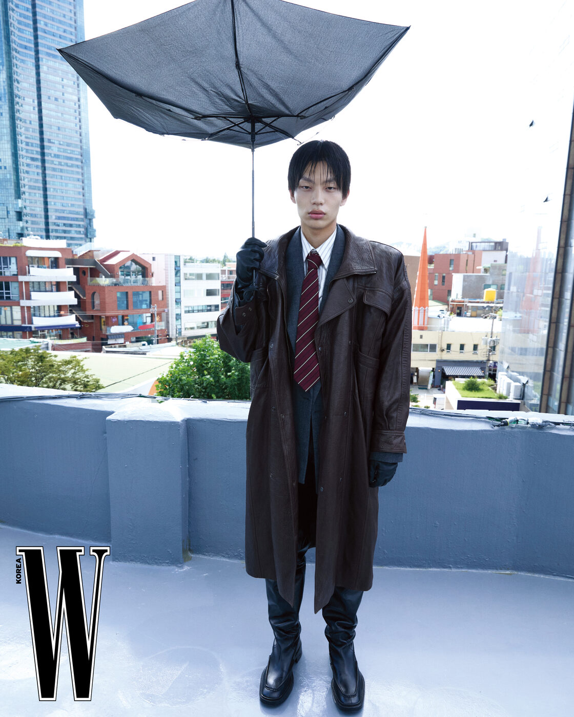검정 코트, 안에 입은 블라우스, 팬츠와 슈즈는 Dior Men 제품.