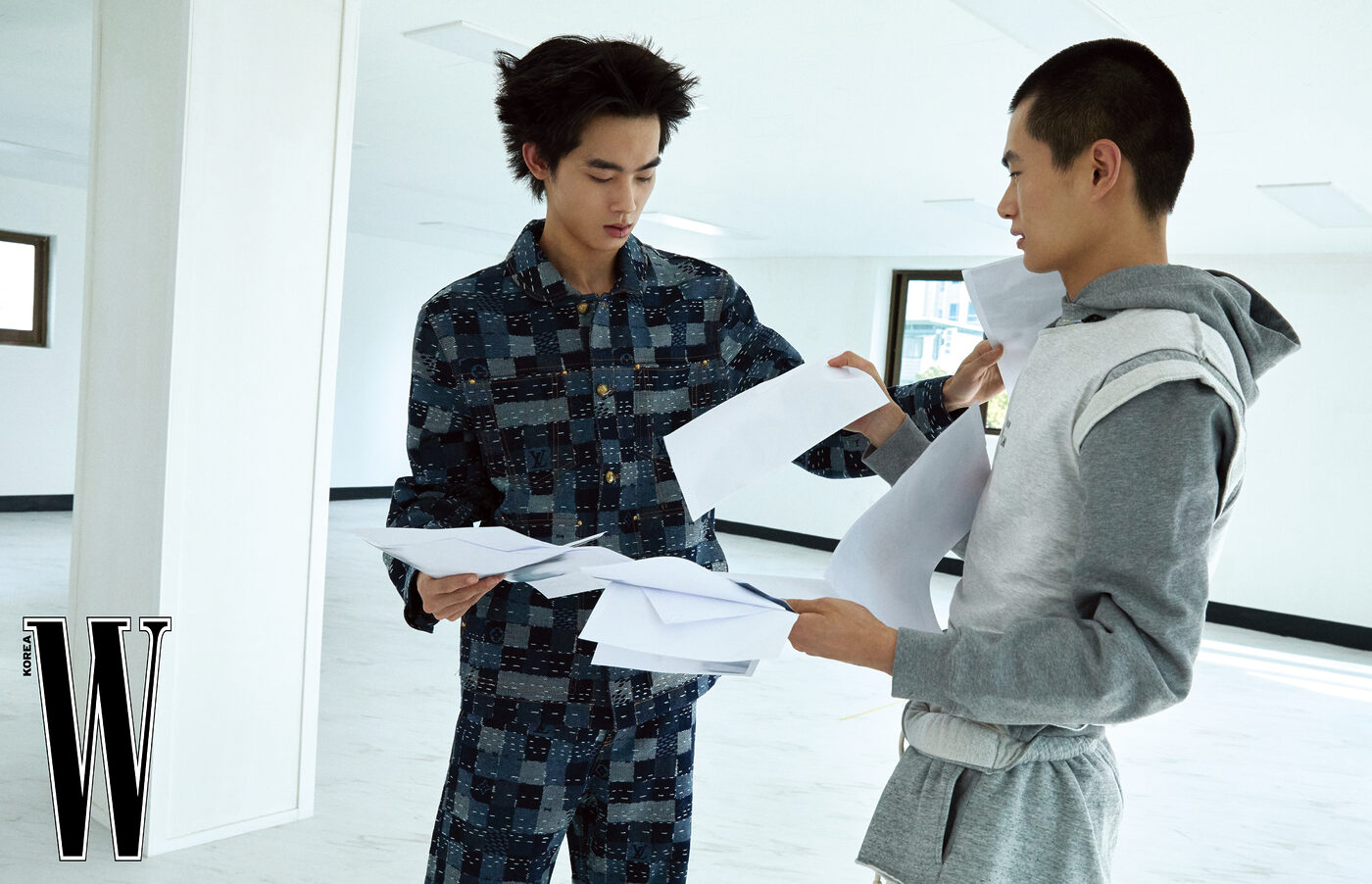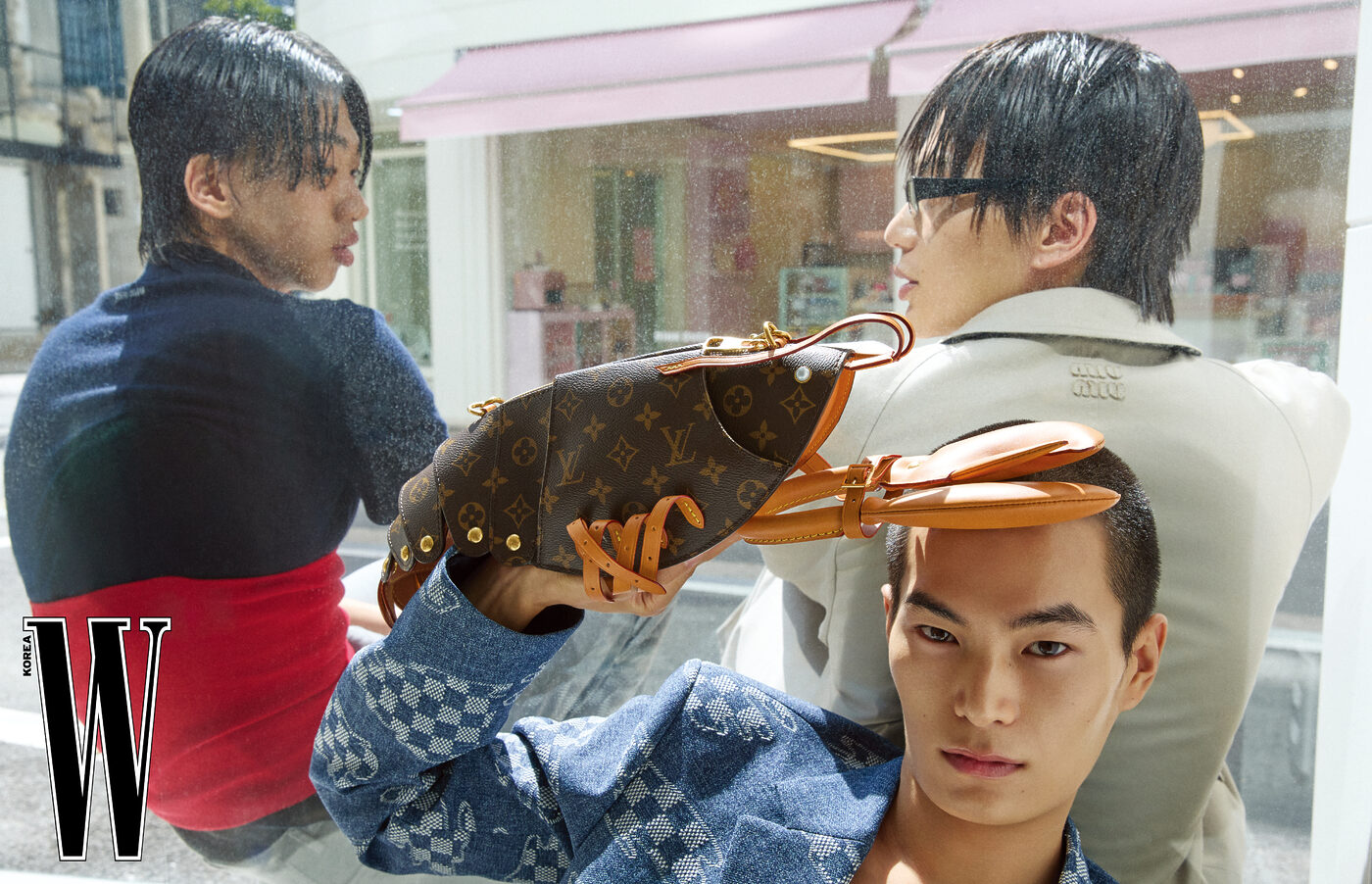 왼쪽부터_데님 재킷과 팬츠는 Louis Vuitton, 후디와 베스트, 쇼츠는 Acne Studios 제품.