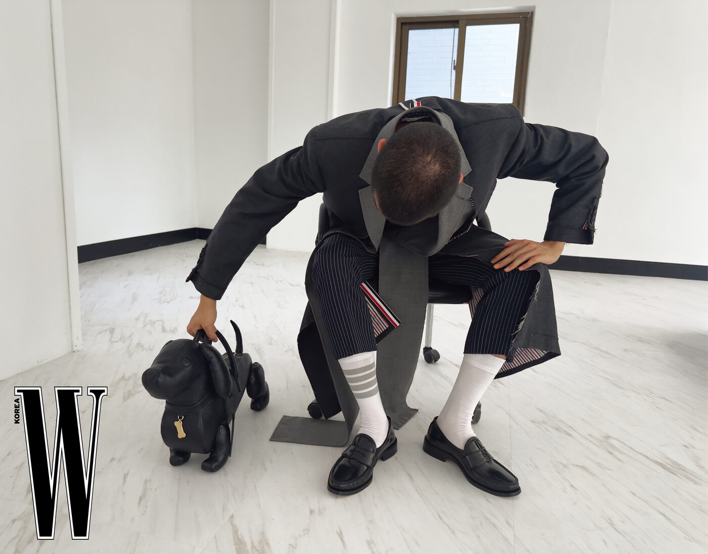 그레이 코트와 핀스트라이프 팬츠, 양말, 슈즈, 헥터 백은 Thom Browne 제품.