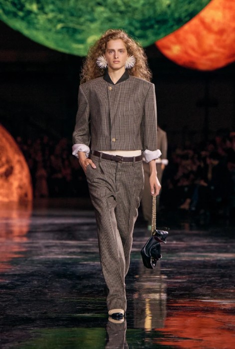 쇼의 가장 중요한 룩이라 할 수 있는 오프닝 룩에서부터 한 껏 구겨지고 열린 백이 등장했는데요. 여유 있는 핏의 재킷과 팬츠에 대충 걷어 올린 소매, 흘러 내린 듯한 바지 허리선 등 마티유가 그리는 쿨한 여성상이 룩과 백에 고스란히 반영되었죠.
