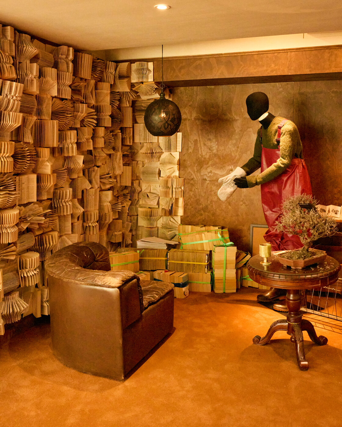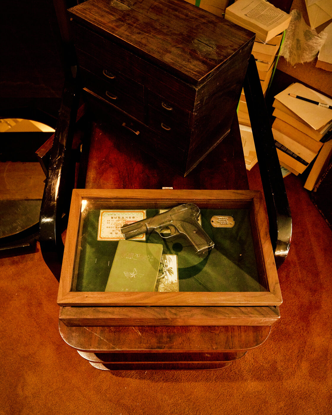 온실에서 옆쪽으로 나오면, 만수의 소지품들이 놓여 있는 책상이 시야에 들어옵니다. 이리저리 흩어져 있는 이력서에서는 치밀한 고뇌의 흔적이 느껴지는 듯하죠. 영화에서 실제로 사용했던 ‘북한제 64식 권총’ 소품도 만나볼 수 있습니다. 이 공간은 자연스레 범모의 음악 감상실로 이어지는데요. 각종 음향 기기와 LP 판이 가득한 가운데, 영화에 삽입된 조용필의 노래 ‘고추잠자리’가 생생하게 울려 퍼집니다. 그 옆으로 자리한 고무 장화와 바지를 입은 마네킹은 영화의 어떤 순간을 떠올리게 하죠. 이렇게 만수의 온실에서 범모의 음악 감상실로 이어지는 일련의 과정 속에서 관람객은 단순히 전시 관람이 아닌 공감각적인 체험을 하게 됩니다.