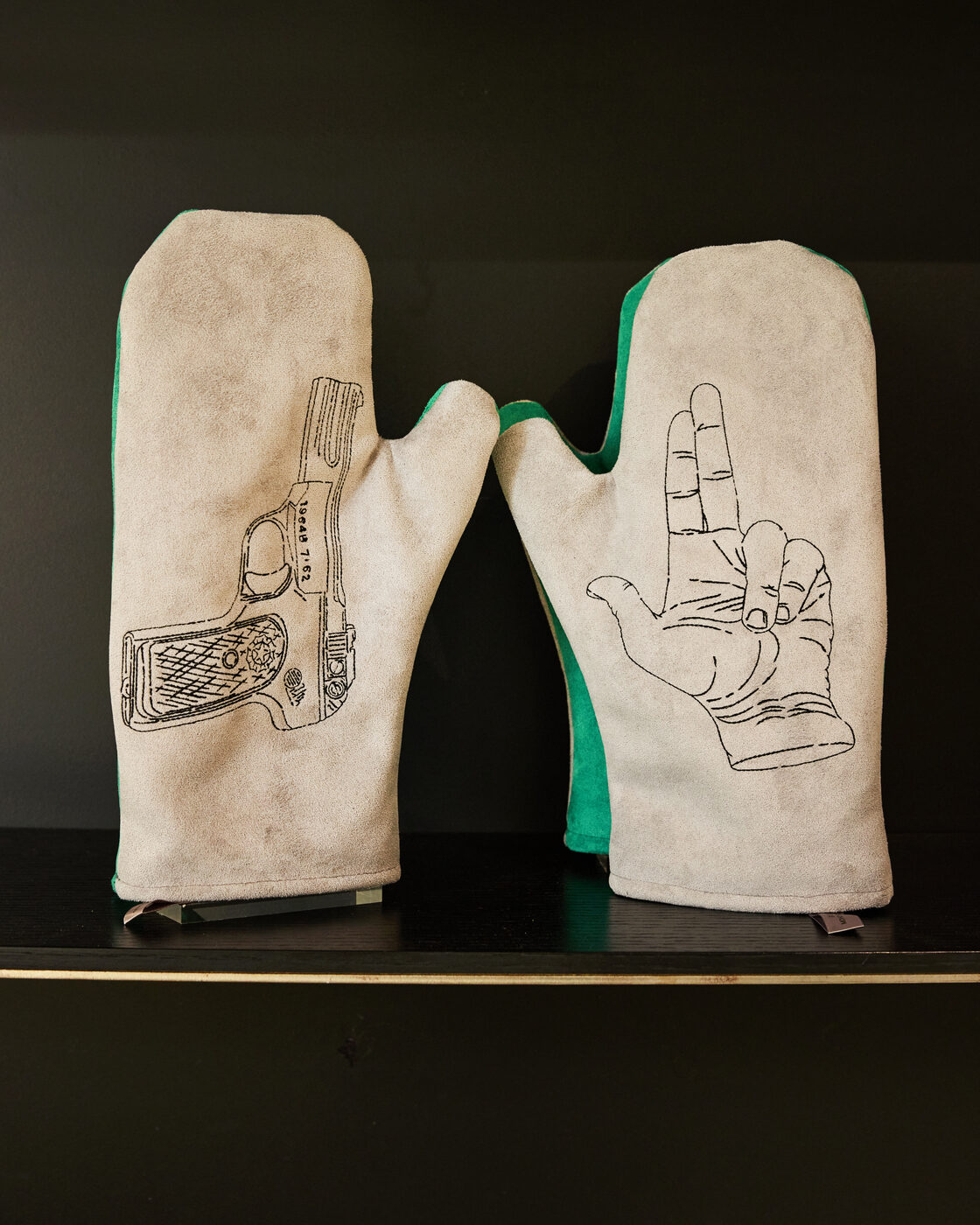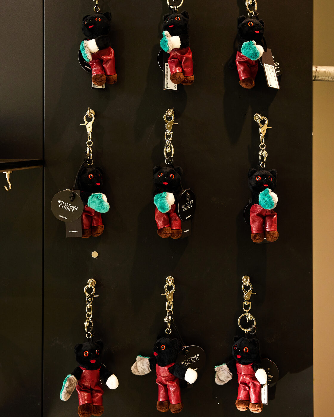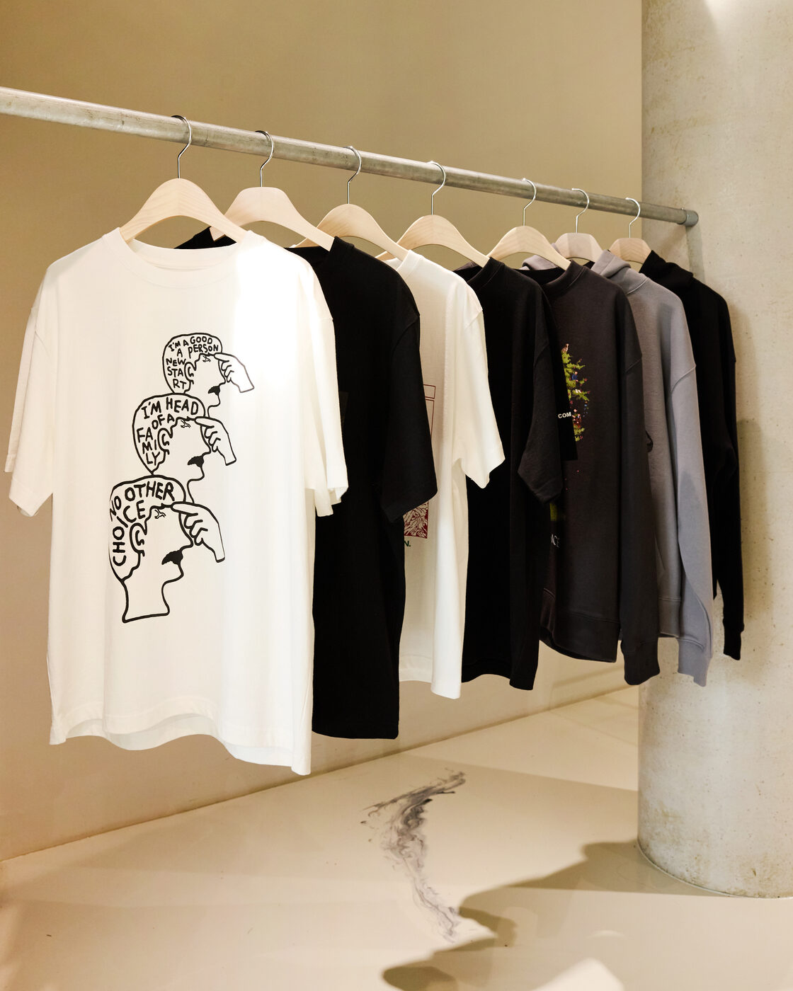 전시를 보고 1층 COMFORT 공간으로 내려오면 다종다양의 굿즈를 구매할 수 있는 팝업스토어가 준비되어 있습니다. 영화 속 단서를 차용한 주방 장갑과 타포린 백, 치아 모양 스티키 노트 등 블랙 코미디적 위트가 깃든 굿즈들이 가득합니다. 또한 워크재킷과 후디, 티셔츠 등 의류 라인업뿐 아니라 만수로 변신한 대표 캐릭터 ‘삐용’ 키링과 시그니처 향을 담은 종이 방향제 등 콤포트와 콜라보한 제품들도 만나볼 수 있죠.