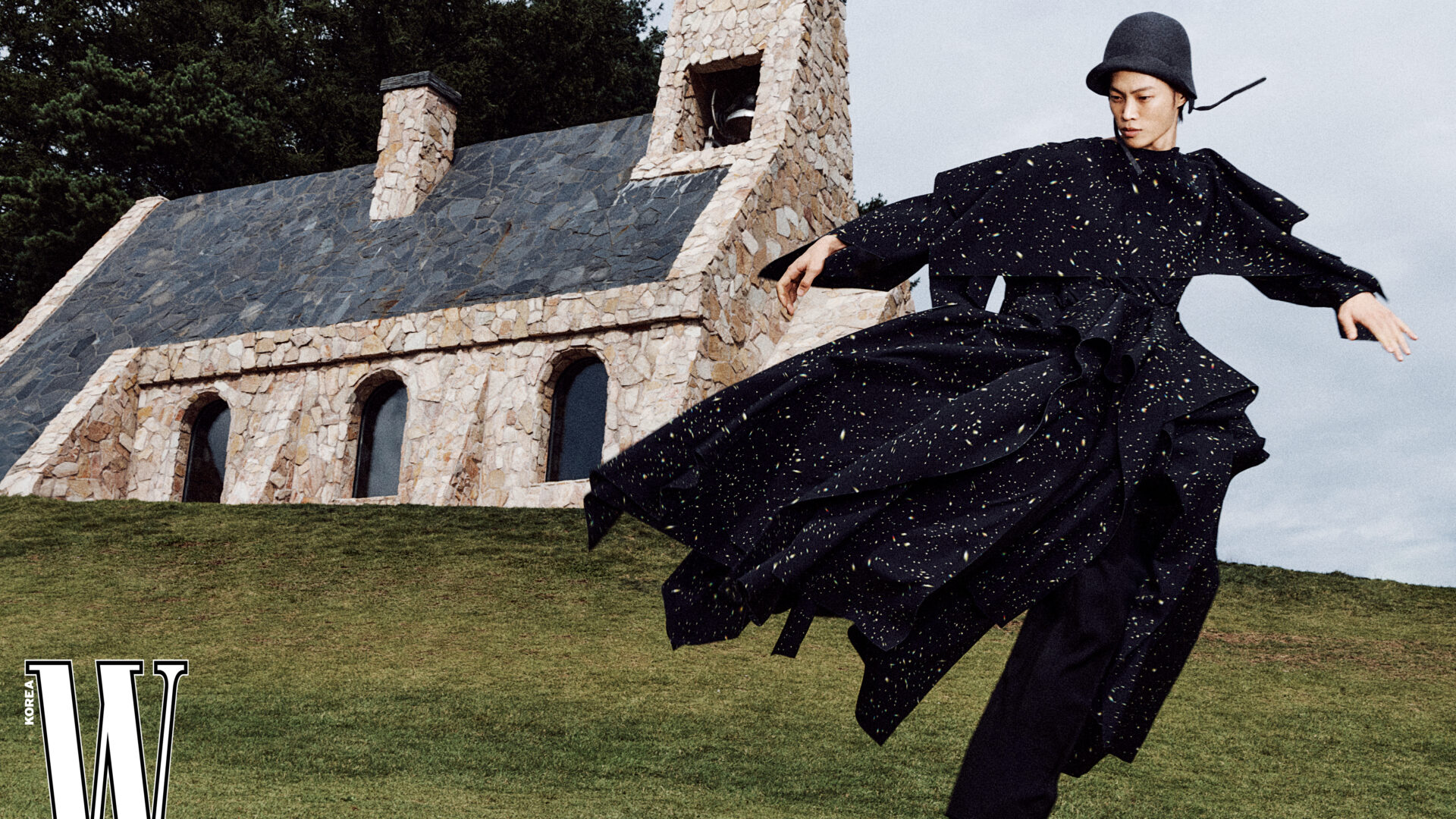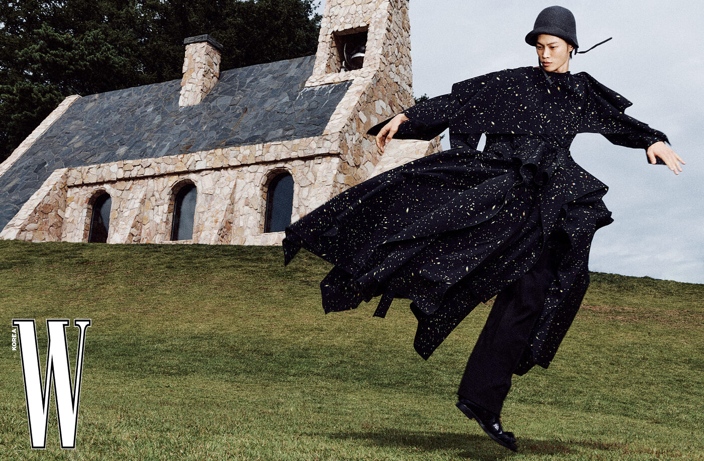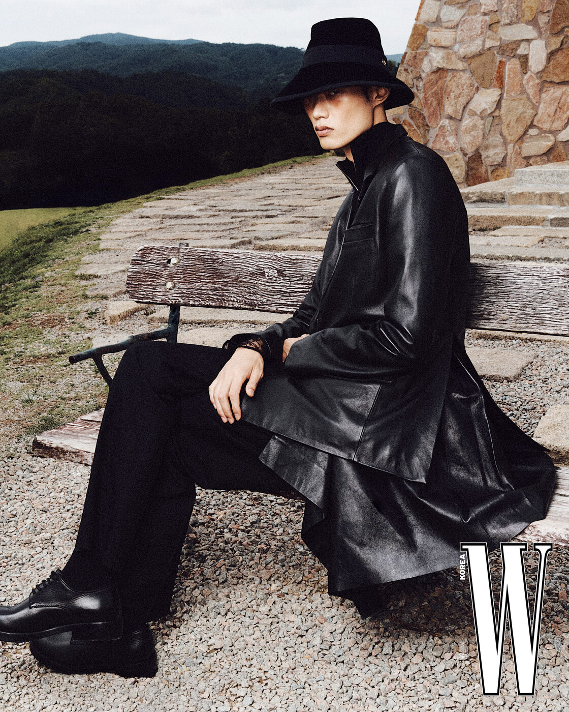 플레어 라인의 가죽 코트는 Eenk, 팬츠는 Fendi, 슈즈는 Dries Van Noten, 버킷햇은 Valentino Garavani 제품.