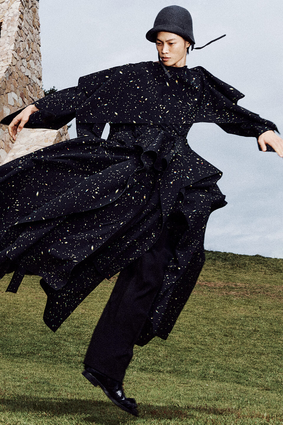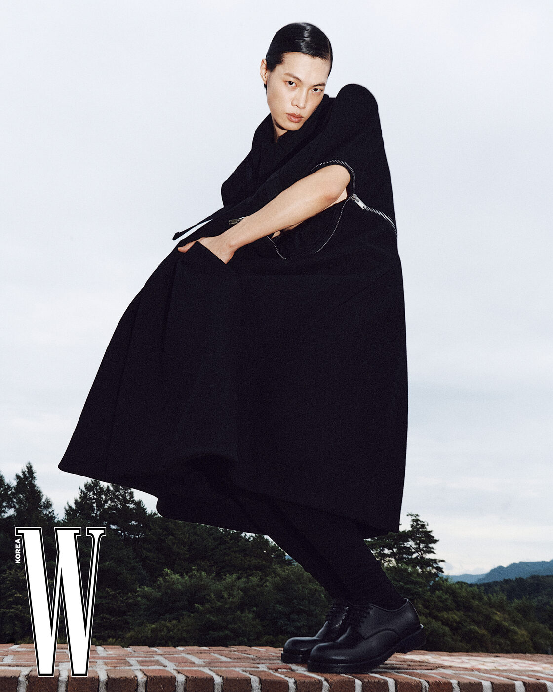 지퍼 장식 가운형 코트와 레깅스는 Rick Owens, 레이스업 슈즈는 Dries Van Noten 제품.