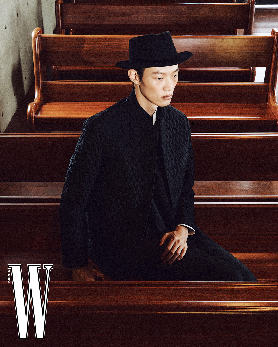 누빔 재킷과 검정 슈트, 페도라는 Loro Piana 제품.