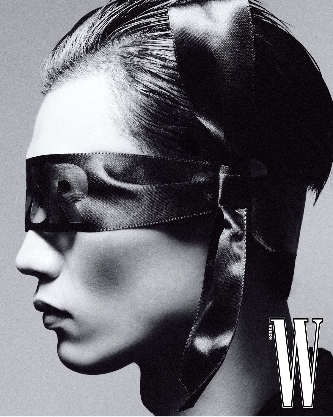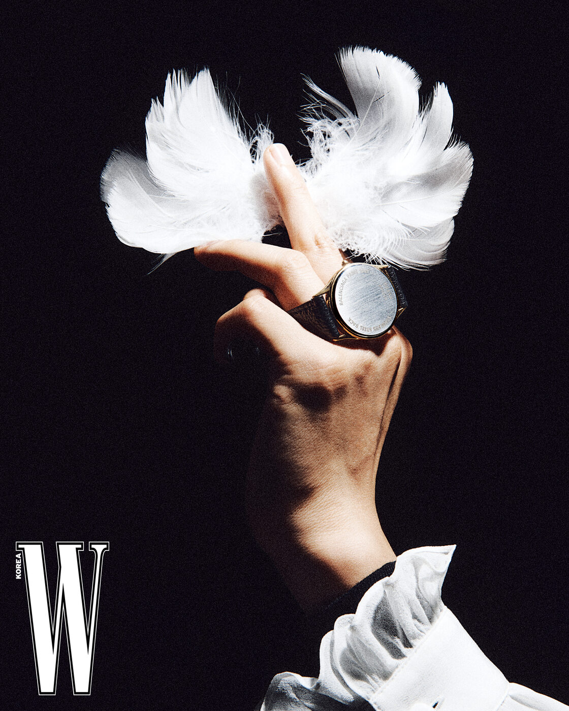 워치 형태의 브레이슬릿은 Balenciaga, 러플 장식 블라우스는 Valentino 제품.