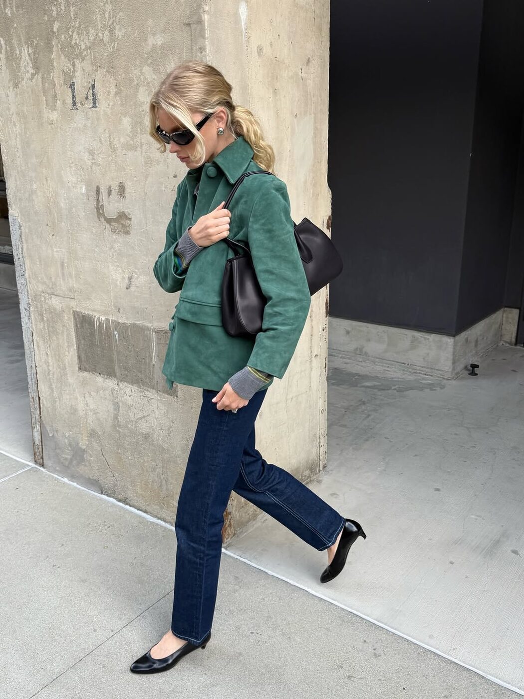 슬림하고 미니멀한 인상의 스웨이드 재킷은 스트레이트 핏 데님과도 궁합이 좋습니다. 여기에 엘사 호스크처럼 키튼 힐을 더하면 한층 도시적이고 세련된 느낌을 줄 수 있어요. 다크 그린 컬러의 재킷에 인디고 데님을 매치한 색조합도 매력적으로 느껴지네요.