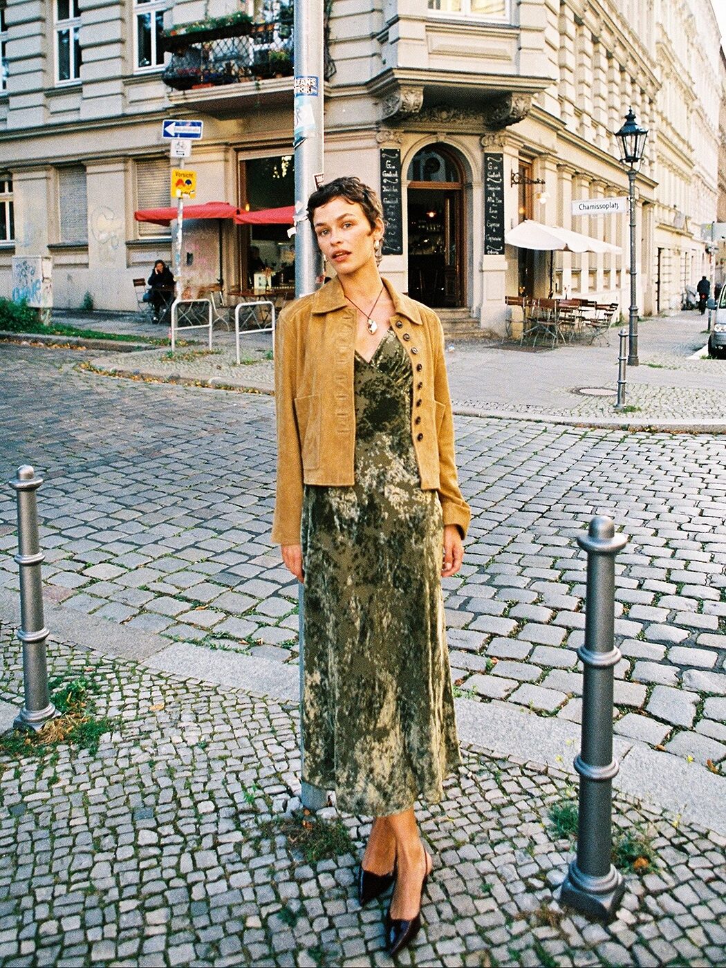부드럽고 차분한 스웨이드 소재는 드레시한 아이템과 만나도 이질감이 없습니다. 직선적으로 떨어지는 실루엣 덕분에 벨벳 드레스 같은 페미닌한 아이템과도 조화를 이루죠.