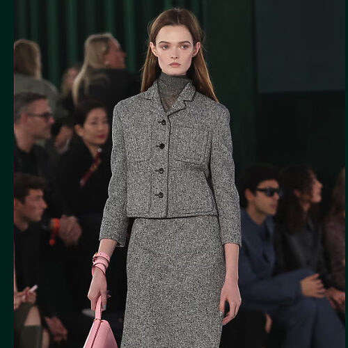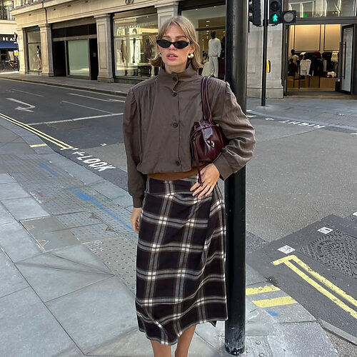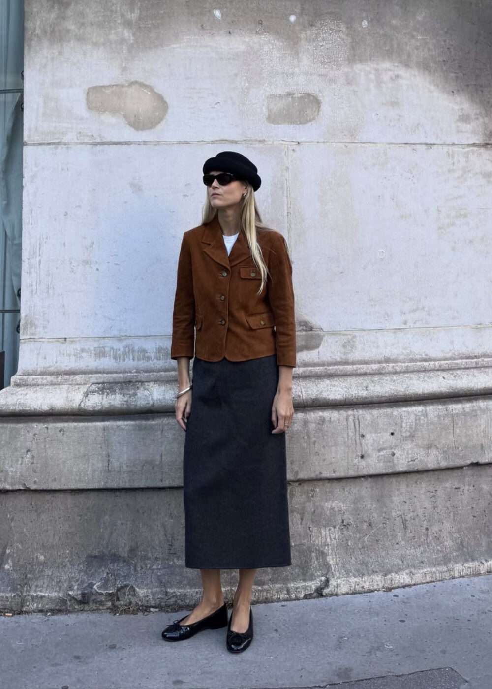 가을 필수 아이템이 된 브라운 스웨이드 재킷과도 어김없이 잘 어울리죠. 길이가 미디 스커트이기에, 재킷은 숏 버전으로 대비를 이뤘어요. 빈티지한 무드의 모자와 걸리시한 발레 슈즈로 파리지엔 분위기를 풍기는 미디 스커트 룩을 선보였습니다.
