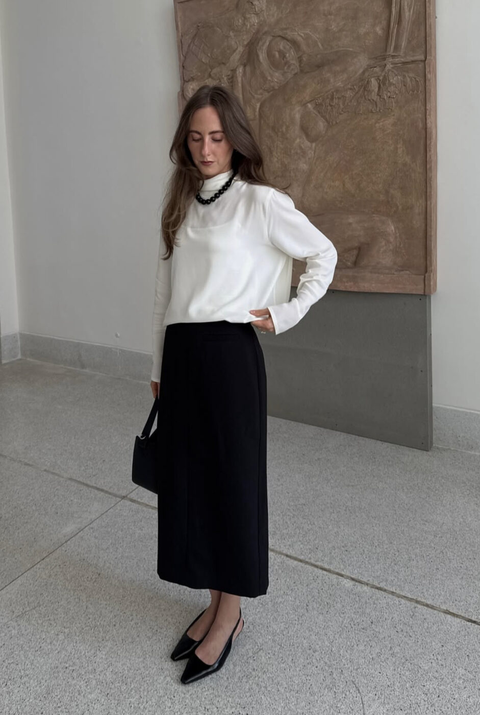 미디 스커트의 장점은 너무 딱딱하거나 전형적인 오피스 룩으로 보이지 않는다는 점이죠. 펜슬 스커트였다면 살짝 지루했을 화이트 블라우스와의 매칭은 적당한 폭과 긴 길이의 스커트로 한층 더 패셔너블한 옷차림이 되었습니다.