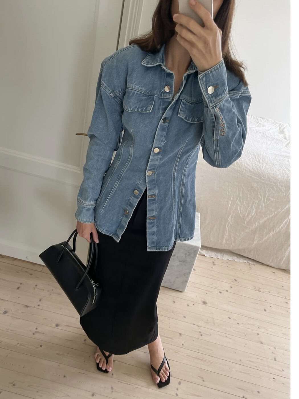 블랙 미디 스커트라고 무조건 여성스럽고 우아한 연출만 한다면 너무 지겹겠죠. 데님을 활용해서 분위기를 바꿔보세요. 포켓 장식의 데님 셔츠 혹은 재킷에 심플한 블랙 스커트 하나면 더 이상 스타일링 할 것도 없습니다. 슈즈와 백 또한 블랙으로 통일해 모던한 무드를 더했습니다.
