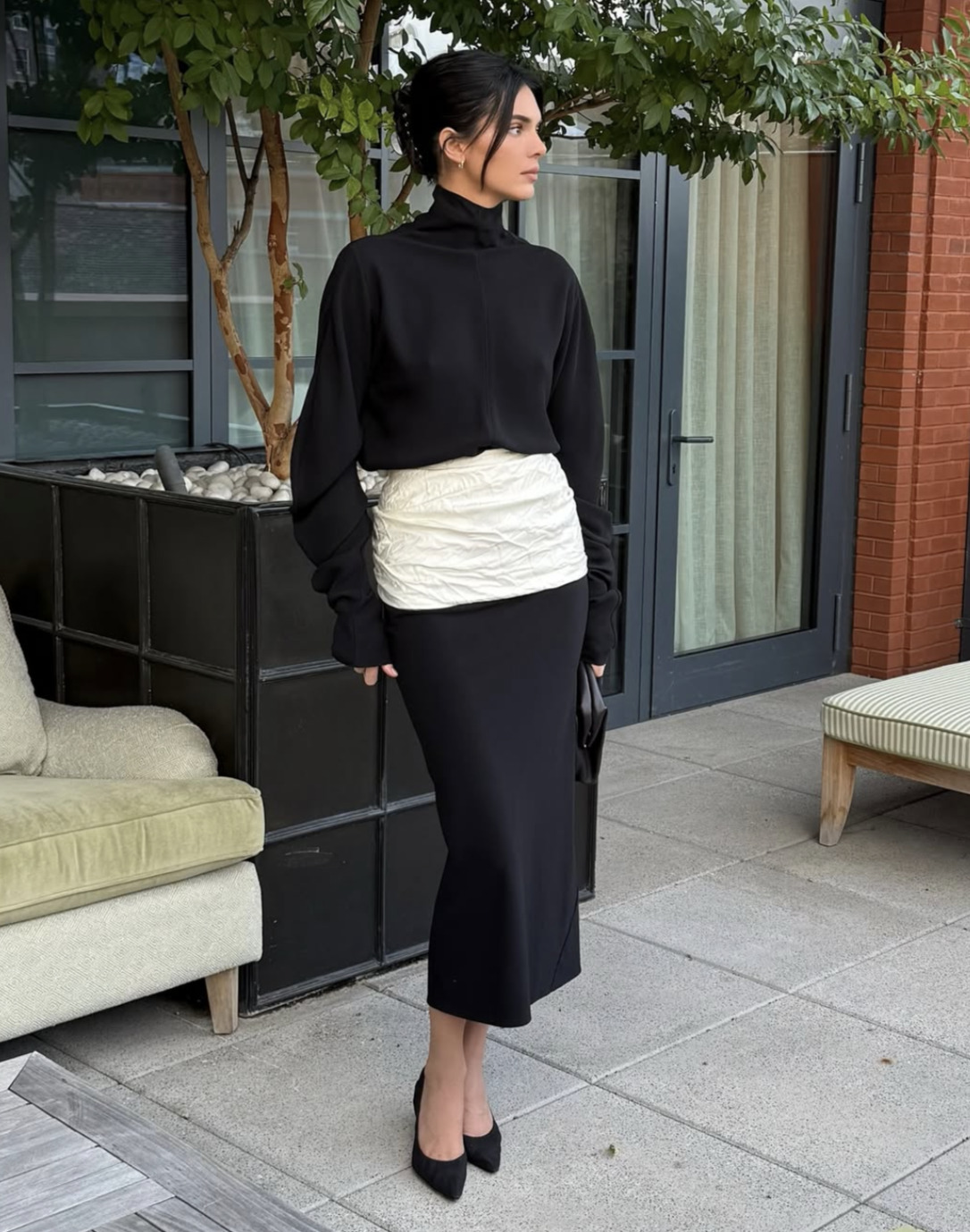 완벽하게 차려 입은 듯한, 드레시한 연출도 가능해요. 켄달 제너는 블랙 미디 스커트와 블랙 터틀넥 톱으로 셋업 패션 효과를 주었죠. 상의의 블랙 톱은 크롭으로, 그 아래 롱 화이트 톱을 레이어링 해 세련된 블랙 & 화이트의 컬러 조합을 이루었어요. 블랙 펌프스 힐로 클래식함도 더했답니다.