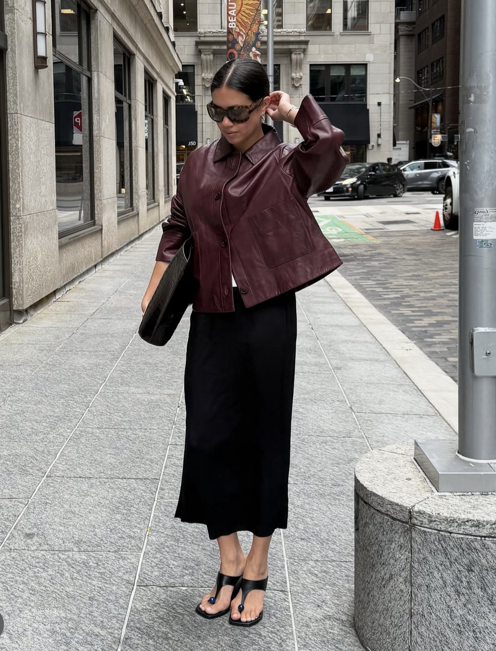 블랙 미디 스커트에 짧은 레더 재킷으로 단정하고 시크한 가을 룩을 선보였어요. 군더더기 없는 모던함을 살린 룩에는 샌들 힐로 가벼움을 더했습니다. 특별할 것 없는 블랙 스커트지만 어떤 스타일의 아우터를 입든 찰떡 궁합을 이룹니다.