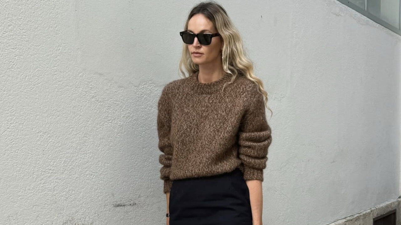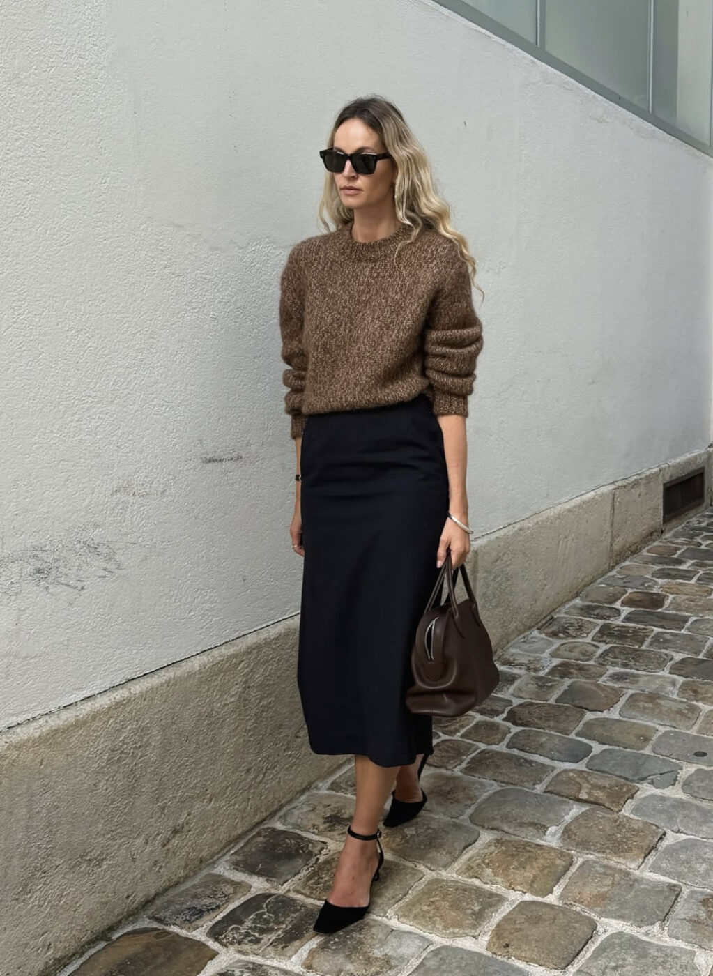 가장 클래식하고 가장 우아한 방식은 역시나 미니멀함을 유지하는 거예요. 제대로 가을 느낌이 나는 브라운 컬러의 도톰한 니트에 심플한 블랙 미디 스커트를 매치해 깔끔하고 세련된 룩을 선보였습니다. 무릎 아래로 내려오는 길이감이 스타일리시해요. 여기엔 스트랩 힐과 토트 백으로 전형적인 레이디 룩을 완성했죠.