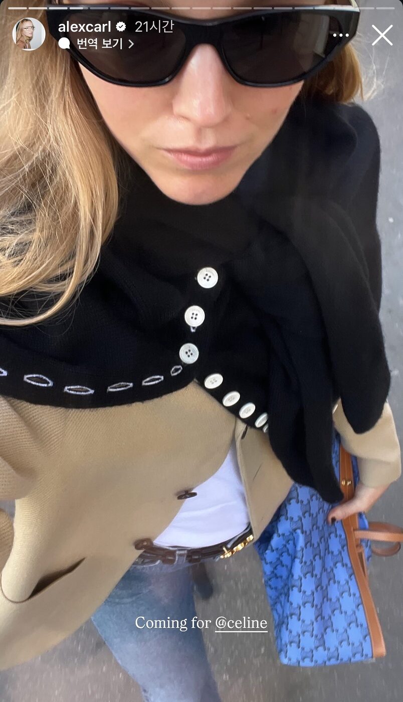스타일리스트 알렉산드라 칼 역시 뷔와 비슷한 스타일링을 하고 셀린 쇼장으로 향했습니다. 다만 알렉산드라는 니트가 아닌 재킷 위에 가디건을 레이어드했죠. 재킷만으로는 쌀쌀하게 느껴지거나, 매일 입는 재킷 스타일링이 지루하게 느껴질 때 참고하기 좋은 스타일링 중 하나죠.