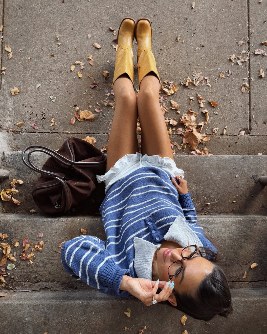 가을 스타일링의 묘미는 계절의 경계를 넘나드는 조합에 있습니다. 사계절 내내 사랑받는 스트라이프 패턴도 니트의 포근한 질감과 만나면 한층 사랑스럽고 포근해지죠. 여름내내 프릴 쇼츠에 툭 걸치기만 해주면 완벽한 가을 룩이 완성됩니다.