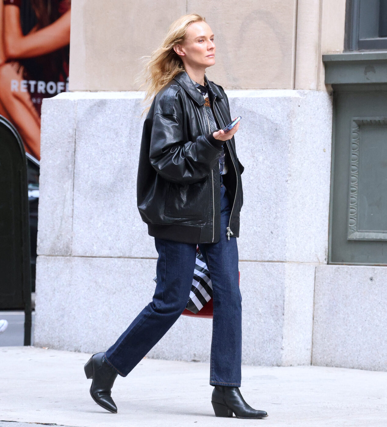 다이앤 크루거는 블랙 레더와 진청의 조합으로 올가을 가장 스타일리시한 스트리트 룩을 선보였습니다. 절대적으로 유행중인 레더 보머 재킷에 일자 라인이 돋보이는 진한 청바지로 깔끔하고 세련된 분위기를 완성했죠. 여기엔 슬림한 라인의 블랙 레더 소재의 앵클 부츠를 신어 시크함을 강조했습니다. 다크함 일색이 룩에는 새빨간 토트 백으로 포인트를 주기도 했어요.