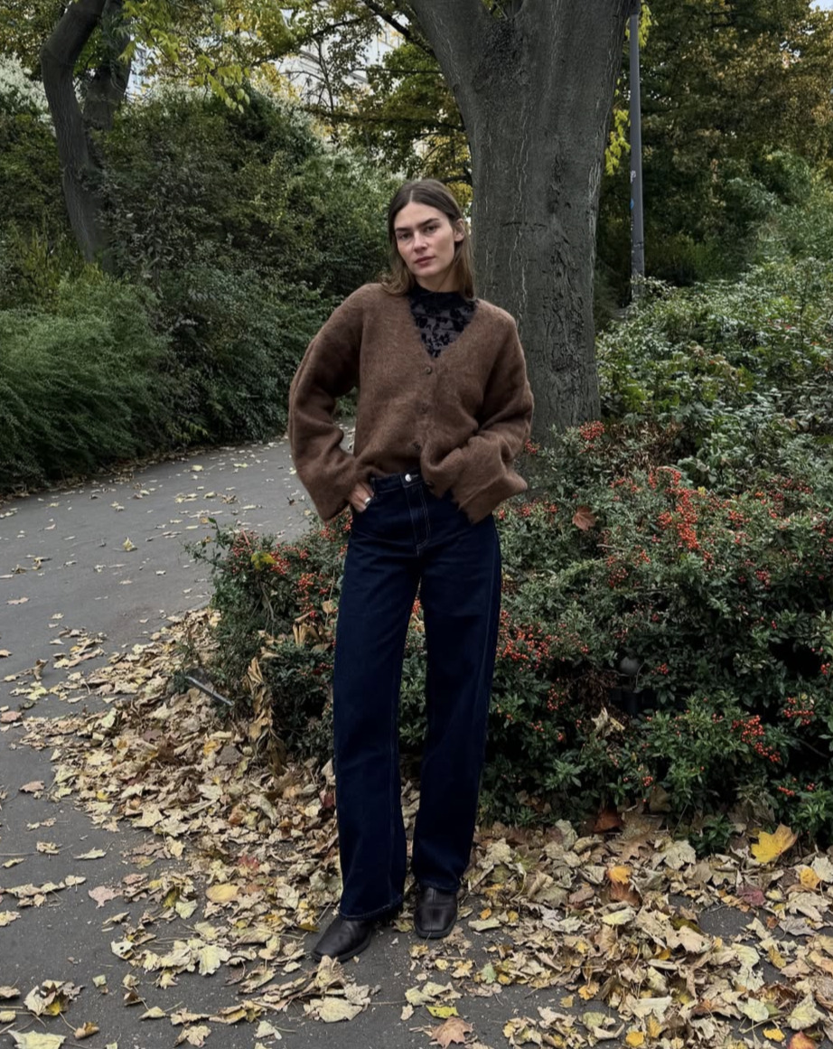 블랙만큼이나 브라운과도 찰떡 조화를 이루는 진청입니다. 진청의 매력을 가장 드러내는 스트레이트 라인의 바지에 포근한 브라운 컬러의 카디건을 매치해 가을 분위기를 진하게 풍겼습니다. 니트 카디건뿐 아니라 브라운 블레이저나 스웨이드 재킷과도 세련된 매칭을 이룹니다.