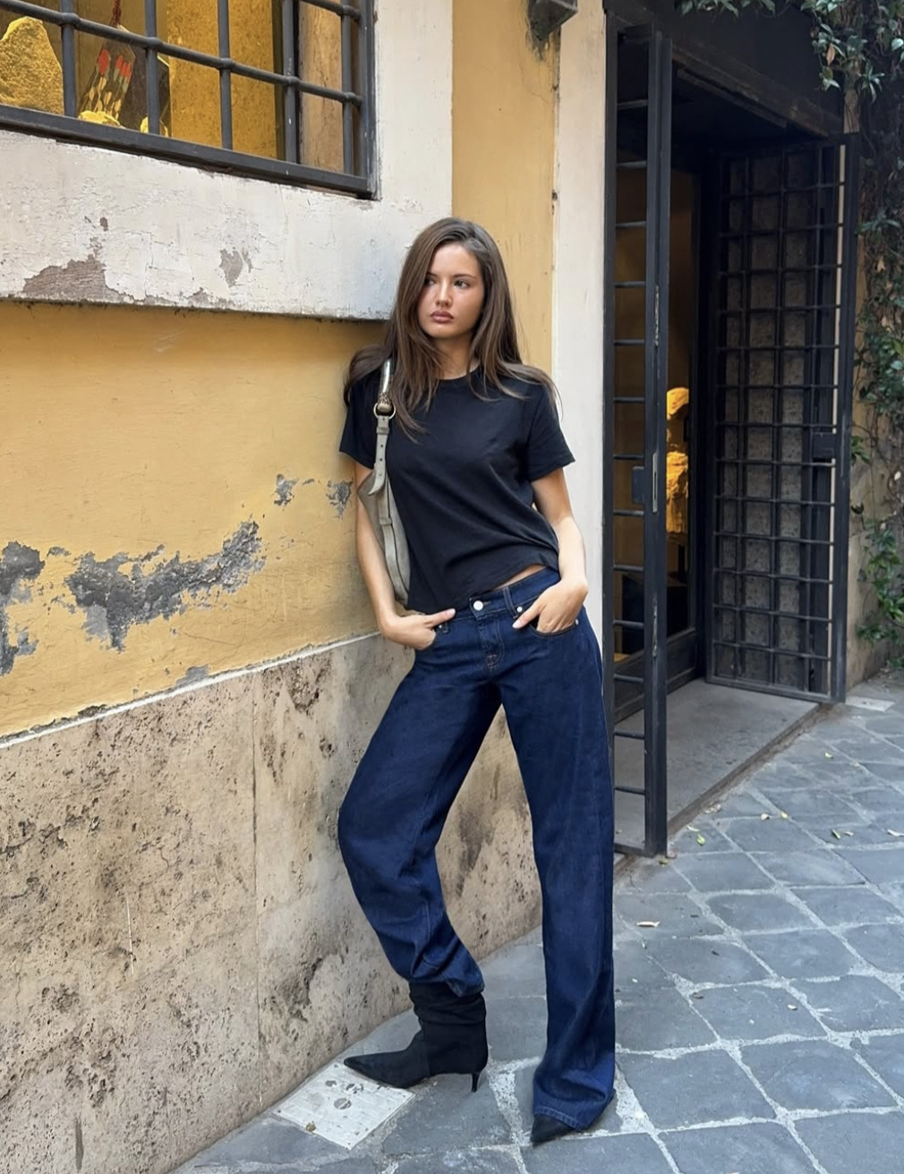 다크한 데님 팬츠엔 마찬가지로 다크한 컬러의 아이템들이 잘 어울립니다. 스타일링을 하기에도 편하죠. 살짝 배기한 실루엣의 진청 데님에 블랙 티셔츠와 블랙 힐을 신어 무심하고도 시크한, 꾸안꾸 룩을 완성했어요. 컬러가 진한 데님은 이렇게 티셔츠 한장과 입어도 완성도 높은 스타일링을 할 수 있답니다.