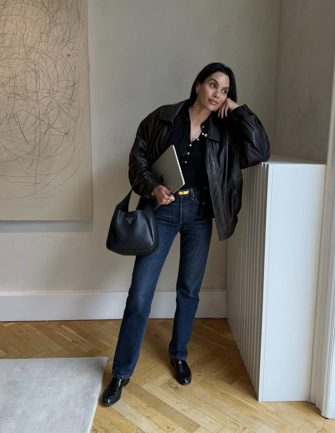스트레이트 라인의 진청 데님 팬츠와 빈티지한 감성의 레더 보머 재킷의 매칭은 공식처럼 외워서 입어도 좋습니다. 프렌치 시크가 진하게 느껴지는 스타일링에는 블랙 셔츠와 블랙 로퍼, 그리고 블랙 숄더 백으로 진청과 블랙의 세련된 조화를 선보였죠.