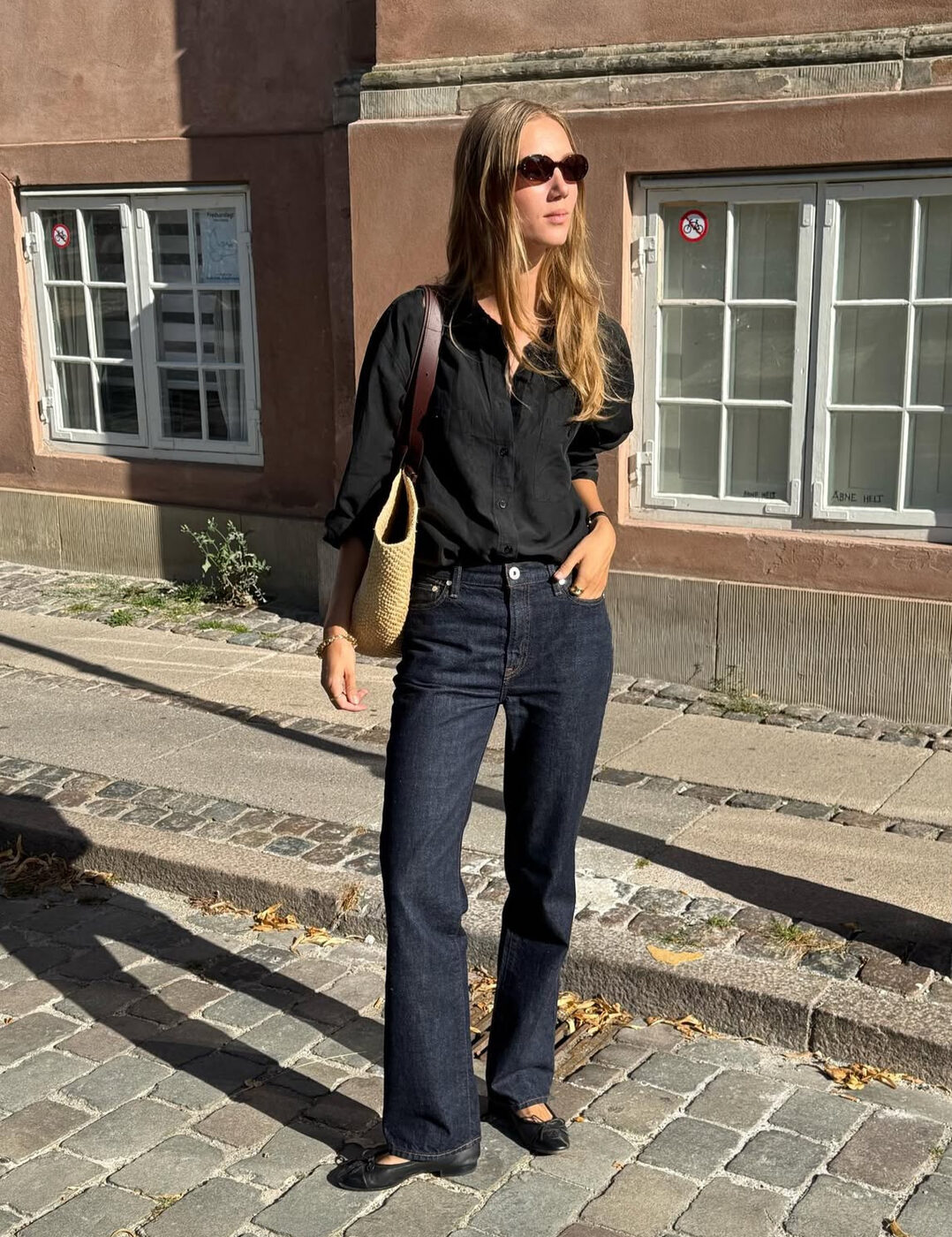 진청 데님 팬츠를 가장 손쉽고 웨어러블하게 입는 방법은 바로 셔츠를 활용하는 거예요. 기본 스타일의 블랙 셔츠는 도회적인 무드를, 핑크색 셔츠는 사랑스럽고 우아한 느낌을 선사합니다. 여기에 일자 라인의 진청을 입고 슈즈는 발레리나 플랫으로 클래식한 터치를 더했어요. 셔츠와 깔맞춤을 해준다면 더욱 스타일리시한 옷차림을 연출할 수 있겠죠. 진청 데님 팬츠가 주는 진한 가을의 맛, 놓치지 말고 즐겨보세요.