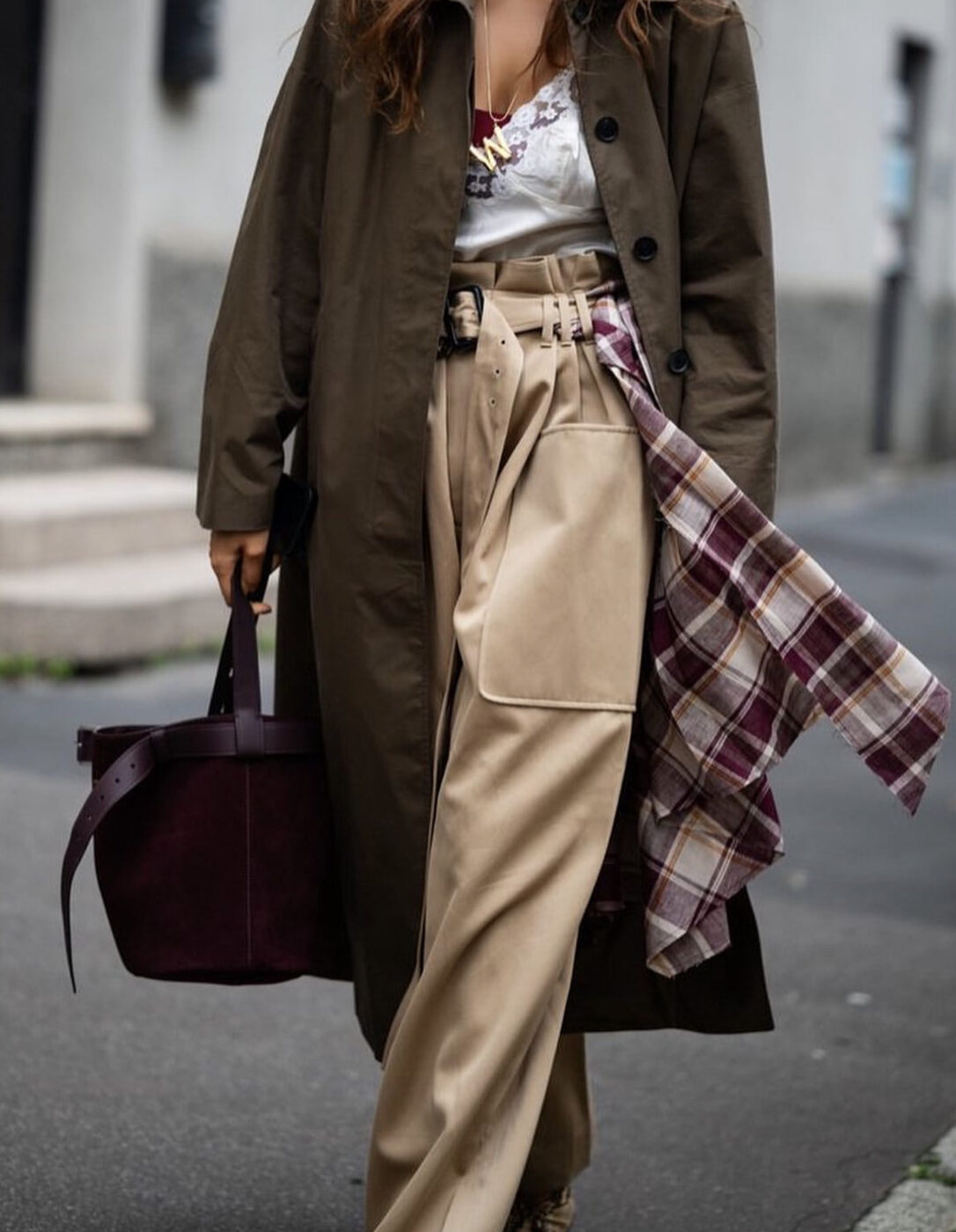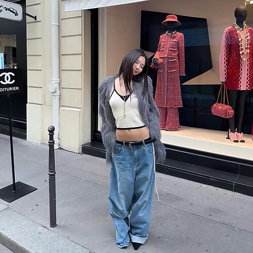포대자루 같은 통 바지를 섹시하게 스타일링할 수도 있습니다. 란제리 풍의 깊게 파인 레이스 톱에 오버사이즈 배기 팬츠를 입어 극과 극의 반전 룩을 완성했어요. 그 위엔 프렌치 코트를 걸쳐 가을 감성 가득한 아웃핏을 선보였습니다.