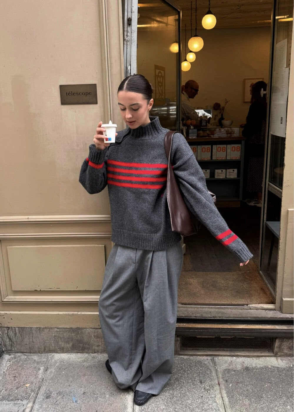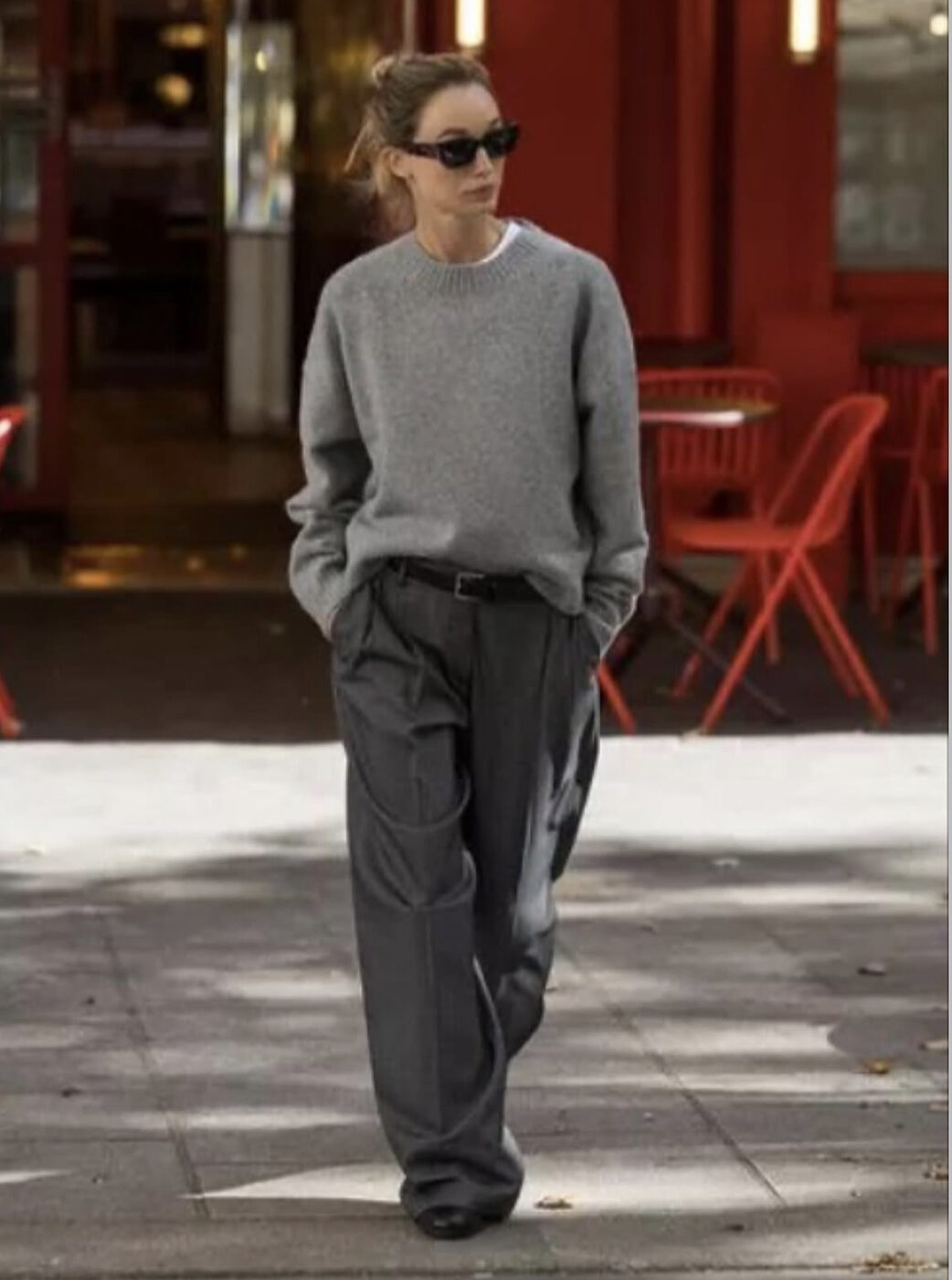 핀턱이 잡힌 커다란 그레이 팬츠에 새빨간 스트라이프 패턴이 장식된 그레이 터틀넥 니트를 툭, 걸쳐 주었어요. 벨트나 다른 액세서리를 하지 않았기에 더 루스하고 내추럴한 멋이 느껴집니다. 팬츠는 땅에 끌릴 만큼 크게, 신발은 클래식한 로퍼를 신어 감각적인 매니시 스타일링을 완성했죠.