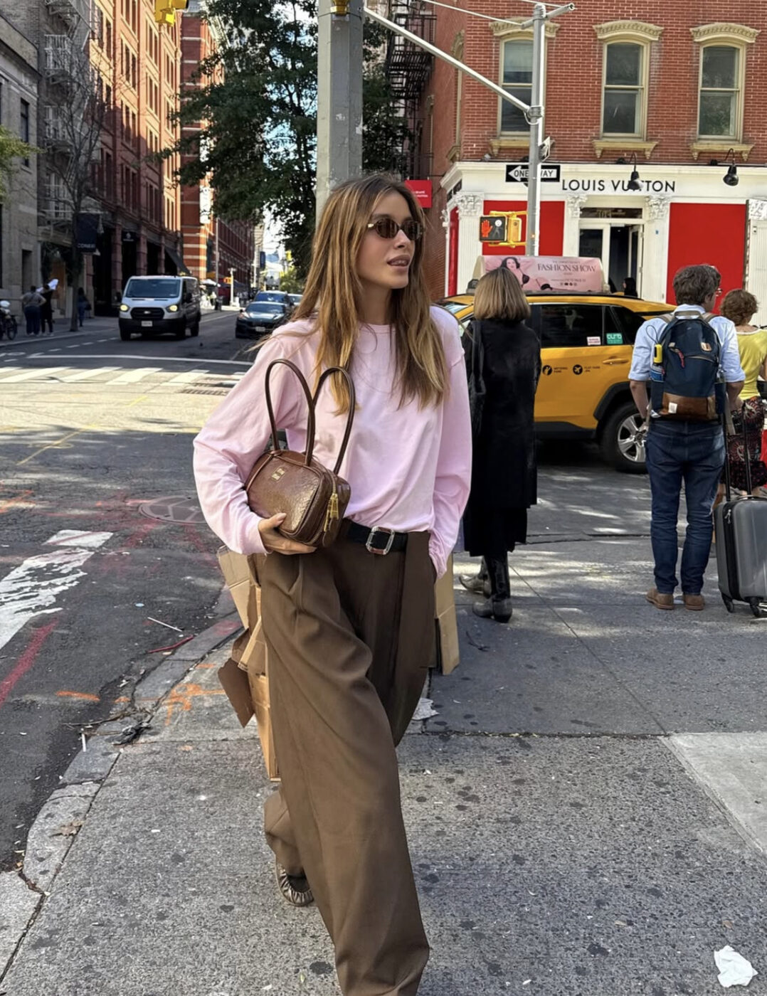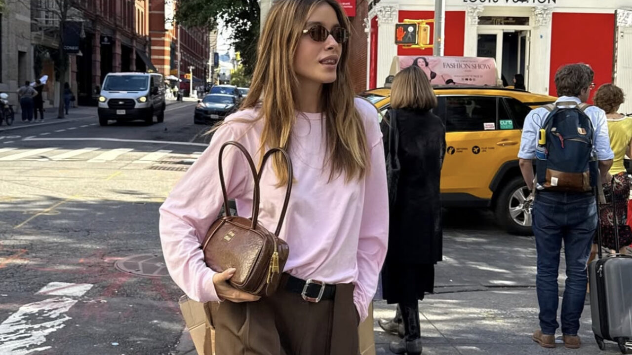 브라운과 핑크로 새로운 컬러 조합을 맛보세요. 기본 디자인의 연한 핑크색 맨투맨에 볼드한 버클 벨트를 한 브라운 배기 팬츠를 매치했을 뿐인데 그 자체로 멋스러움이 느껴지죠. 오버핏이 주는 매니시함이 시크한 룩에는 브라운 토트 백을 들어 단정하고 클래식한 터치를 더했어요.