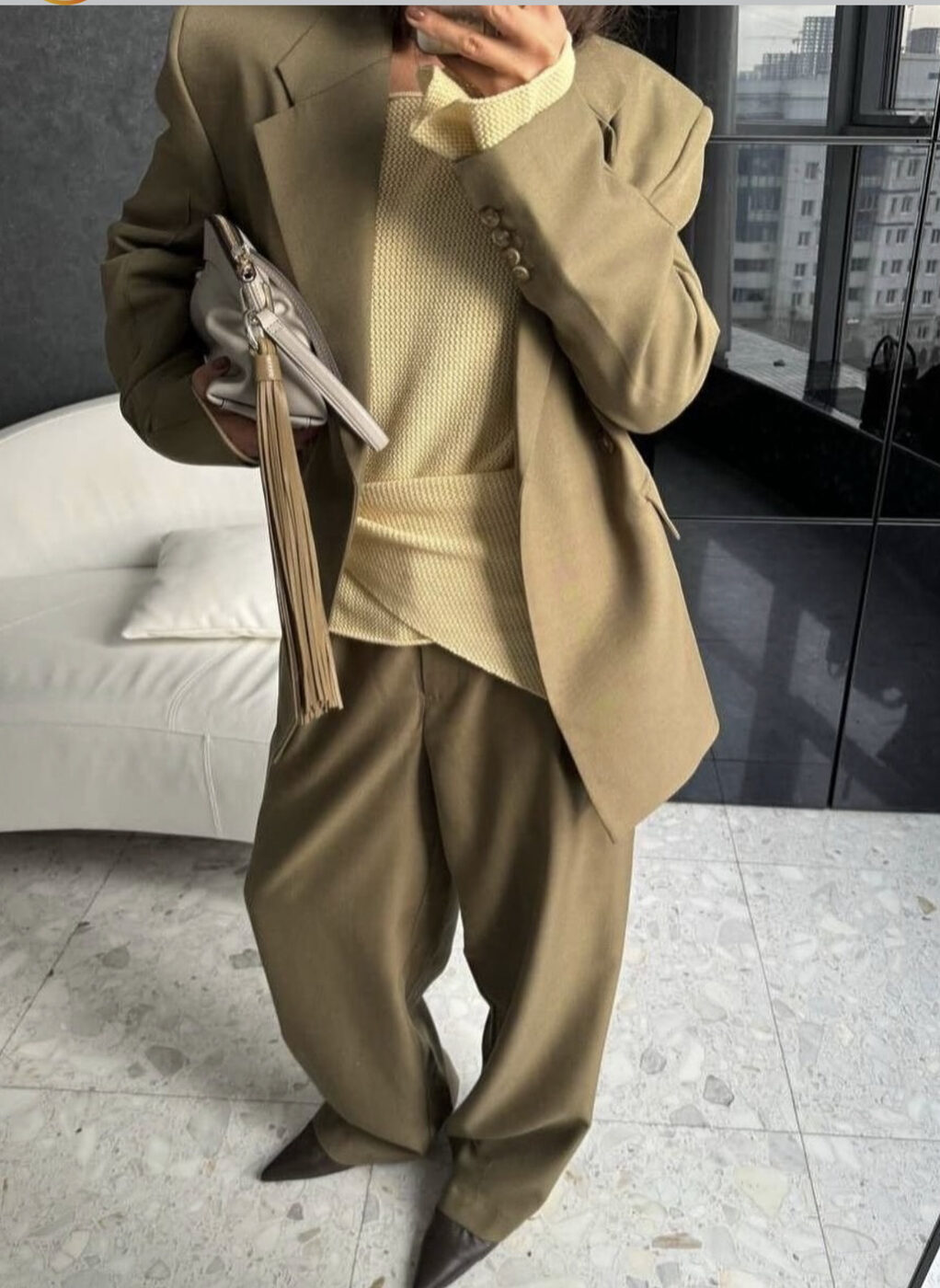 흘러내릴 듯한 와이드 실루엣의 팬츠에 매니시한 블레이저, 이 쿨하고 멋진 룩을 더욱 시크하게 만들어 주는 건 하나의 색으로 통일했기 때문이에요. 라인 자체가 큰 옷들을 컬러마저 복잡하게 연출한다면 세려됨과는 거리가 멀어집니다. 비슷한 컬러로 깔 맞춤에 신경을 써 보세요.