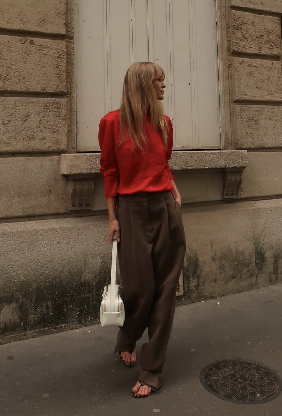 이 펑퍼짐한 바지의 매력은 그저 심플하고 평범한 기본 톱 하나만 입어도 꾸안꾸 무드의 자연스러운 쿨한 패션이 완성된다는 거에요. 아이템은 평범하나, 대신 컬러 선택에 신중을 기해보세요. 브라운 팬츠와 새빨간 레드 톱, 그리고 새하얀 백을 든 모습이 돋보입니다.