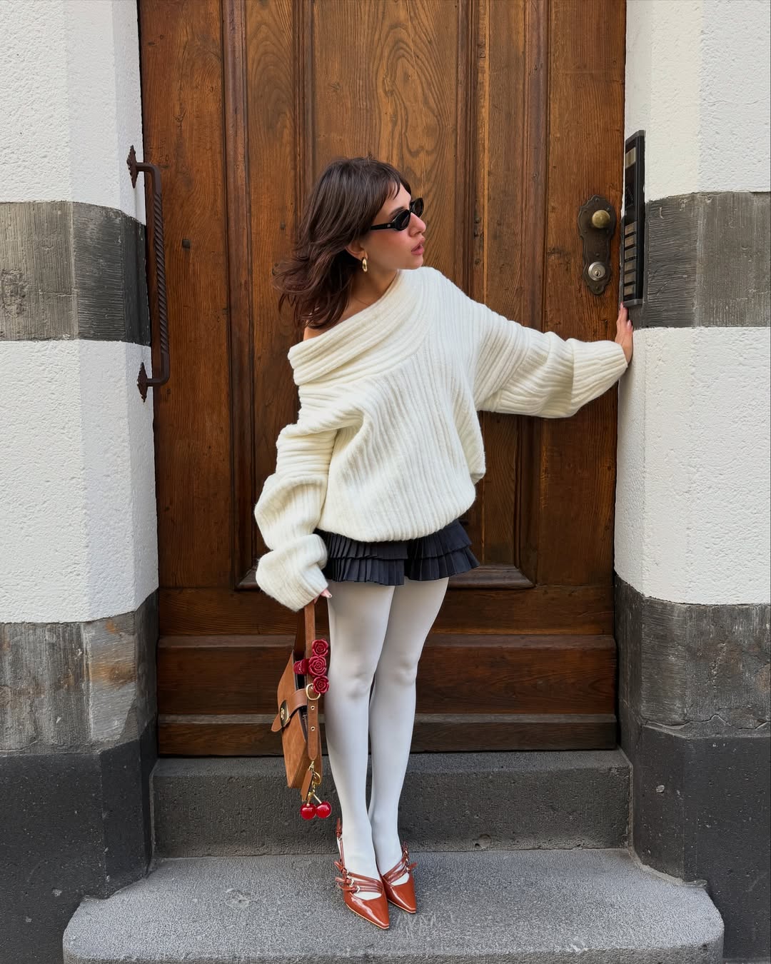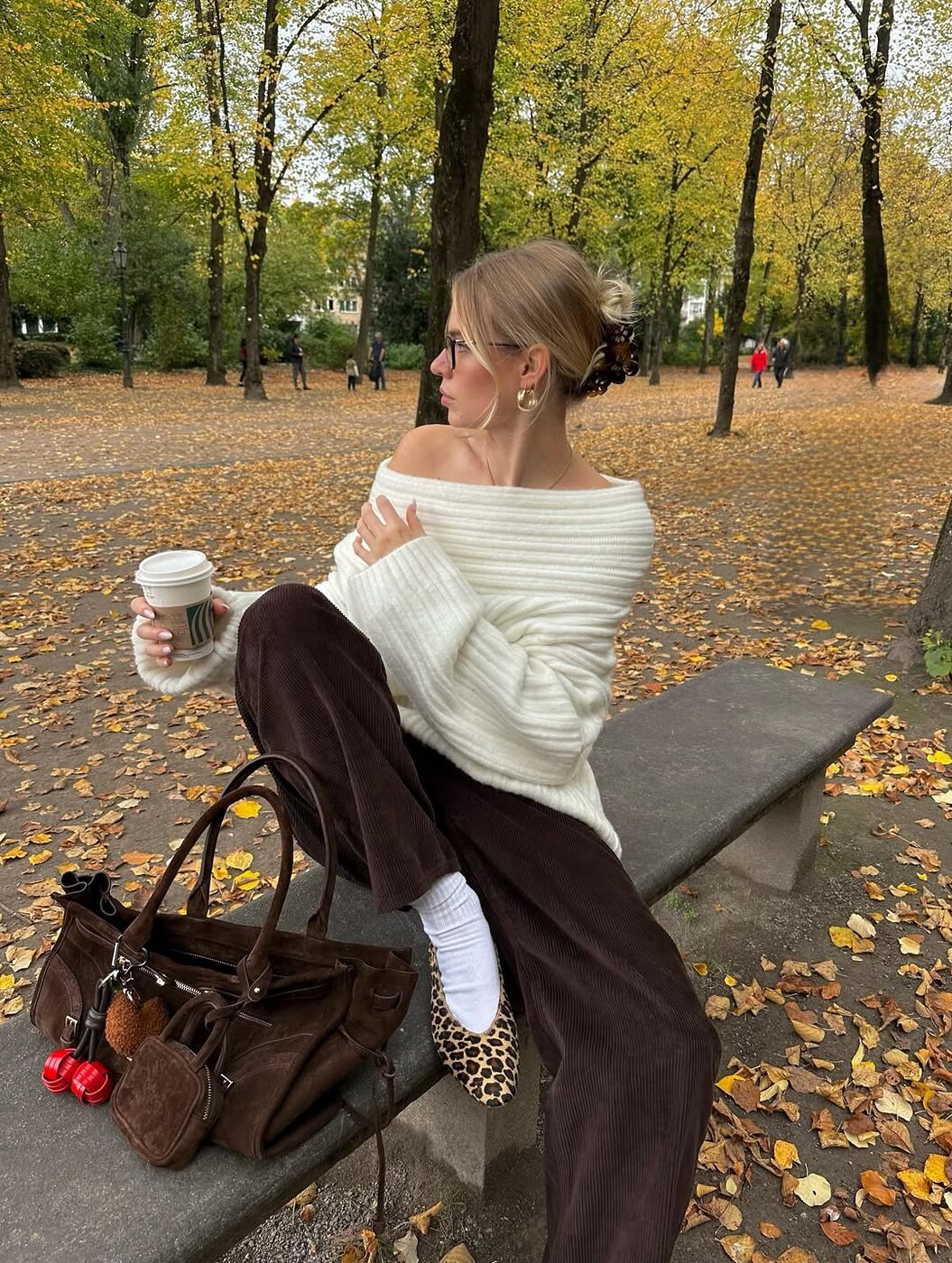 새하얀 니트는 하나쯤 가지고 있으면 어떤 하의와도 잘 어울려 스타일링이 쉬워집니다. 니트 특유의 묵직한 짜임과 무게감 덕에 실루엣이 훨씬 부드럽고 페미닌해 보이죠. 날이 쌀쌀해진 만큼 따뜻하고 코지한 느낌을 더하는 골드 액세서리를 함께 곁들여 보는 것도 좋겠군요.