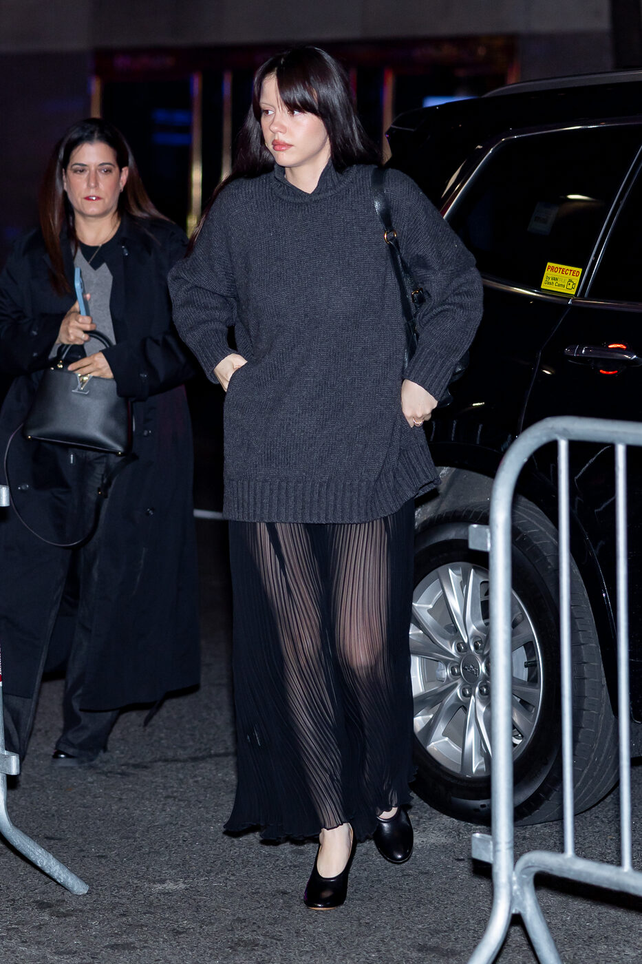 미아 고스는 박시한 니트 한 벌로 가을 분위기의 시스루 룩을 완성했습니다. 시스루 스커트에 별다른 팬츠나 스커트 레이어링 없이 어두운 그레이 톤의 박시한 실루엣이 노출을 자연스럽게 가려주면서 세련된 인상을 주죠.